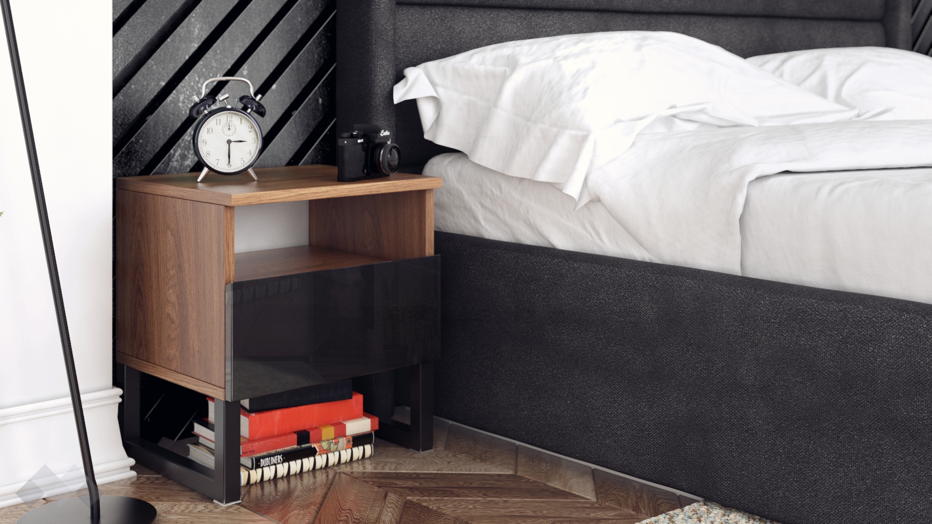 Ако държиш на стилните и практични мебели, нощно шкафче Лунар ще ти допадне. То е перфектното допълнение към обзавеждането в спалнята. Модерната цветова комбинация ти дава възможност да го съчетаеш както със светъл, така и с тъмен декор.