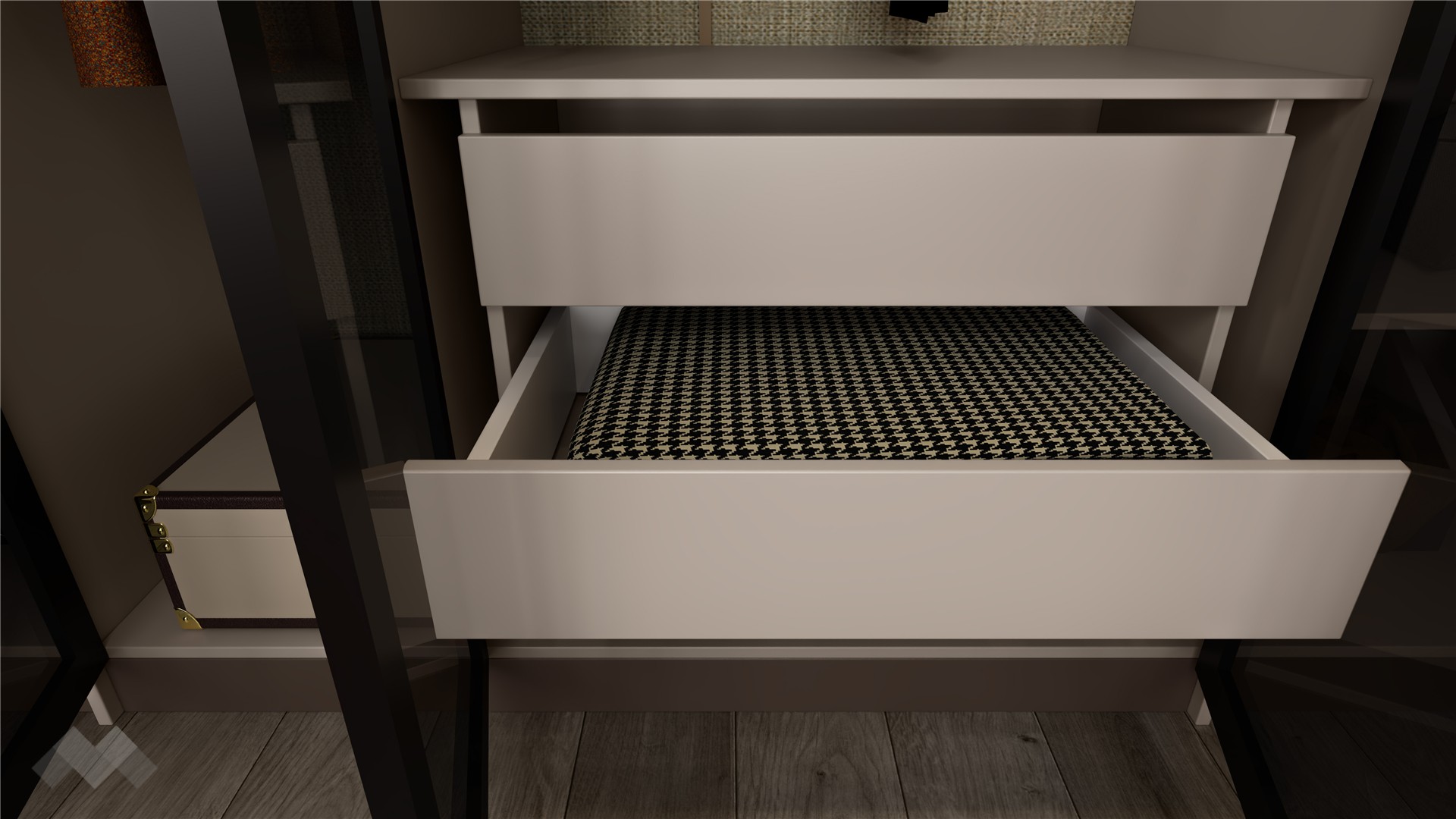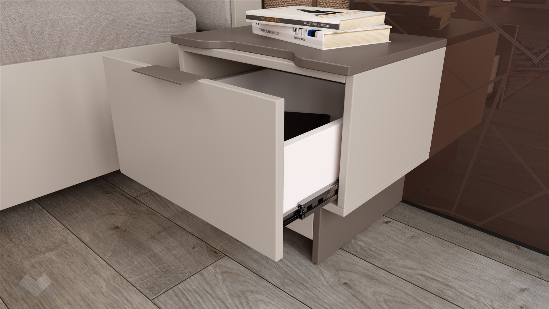 Комплектът включва и две нощни шкафчета с чекмедже, които предлагат удобно място за най-необходимите вещи. Благодарение на сачмените водачи, чекмеджетата се изтеглят леко и стабилно, като издържат и при по-голямо натоварване.