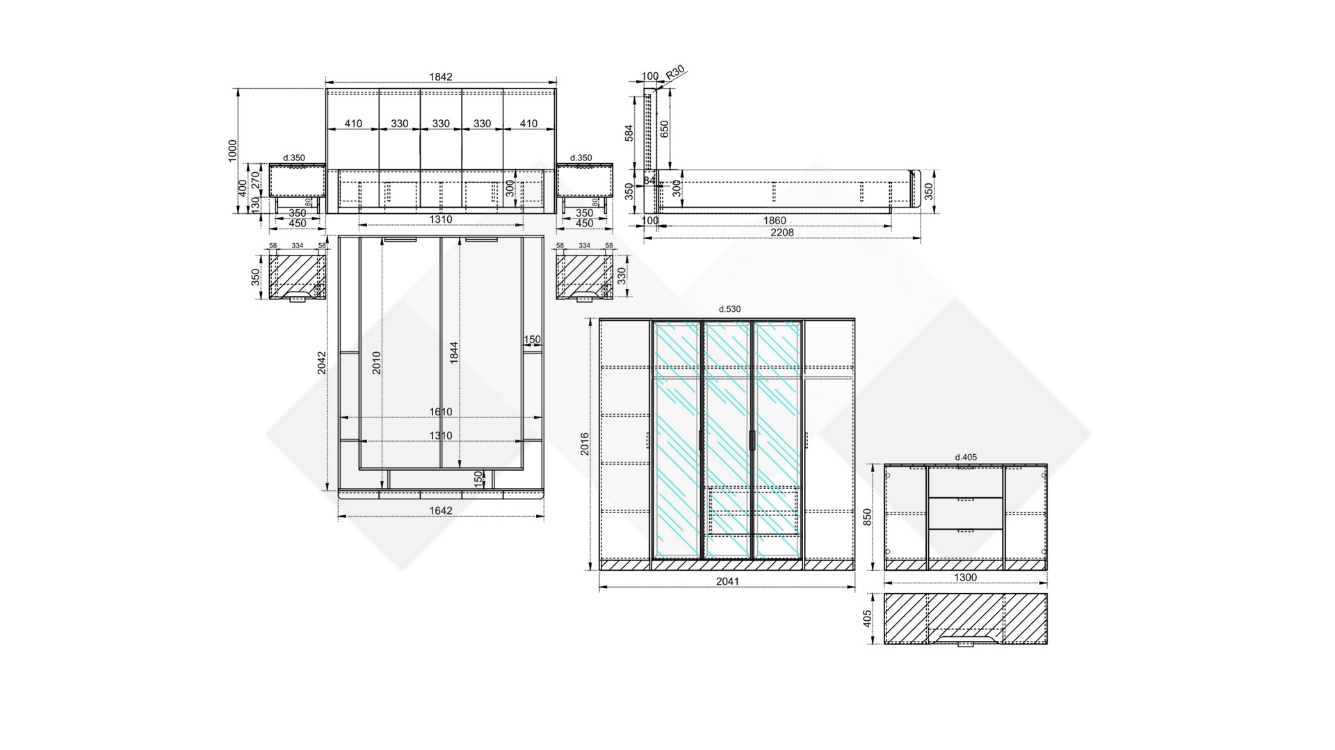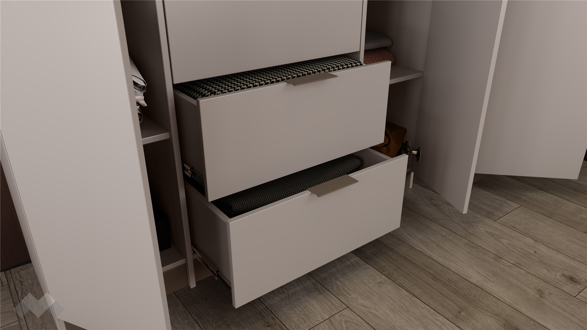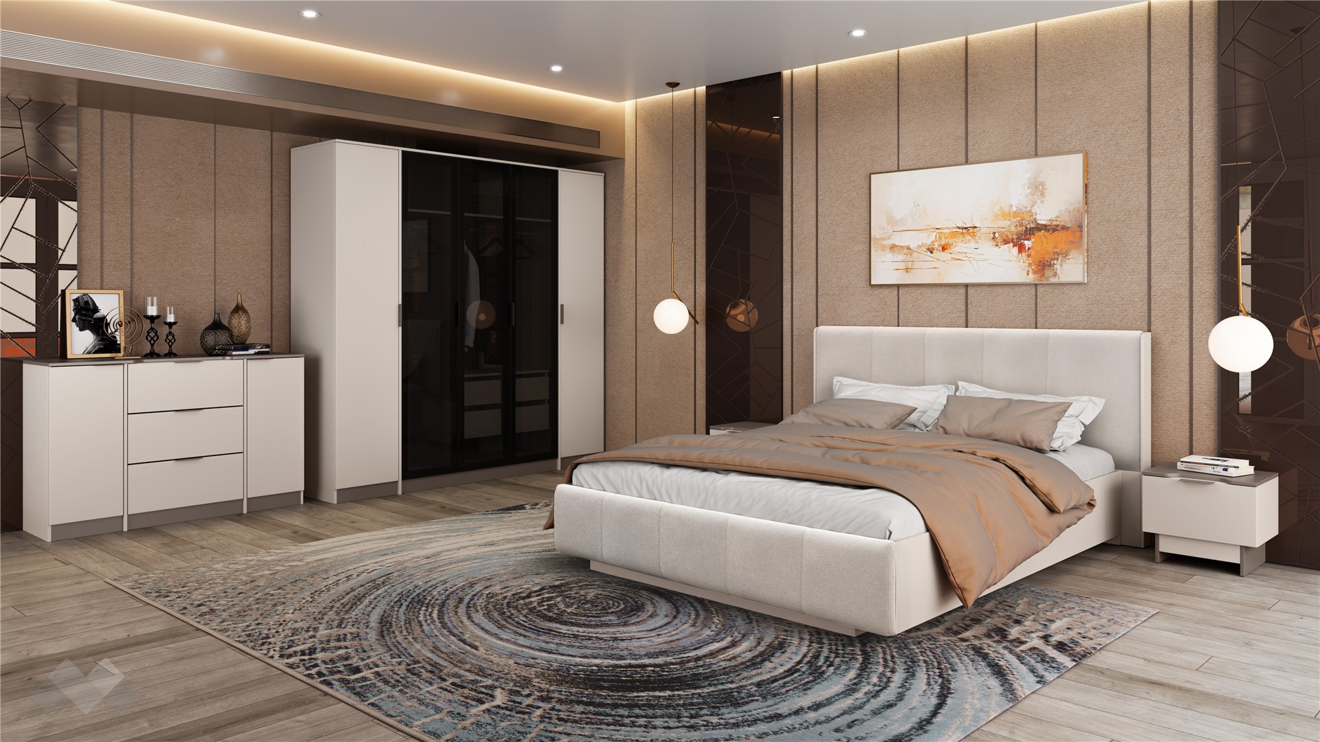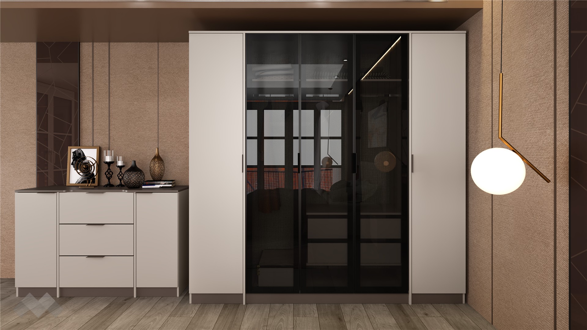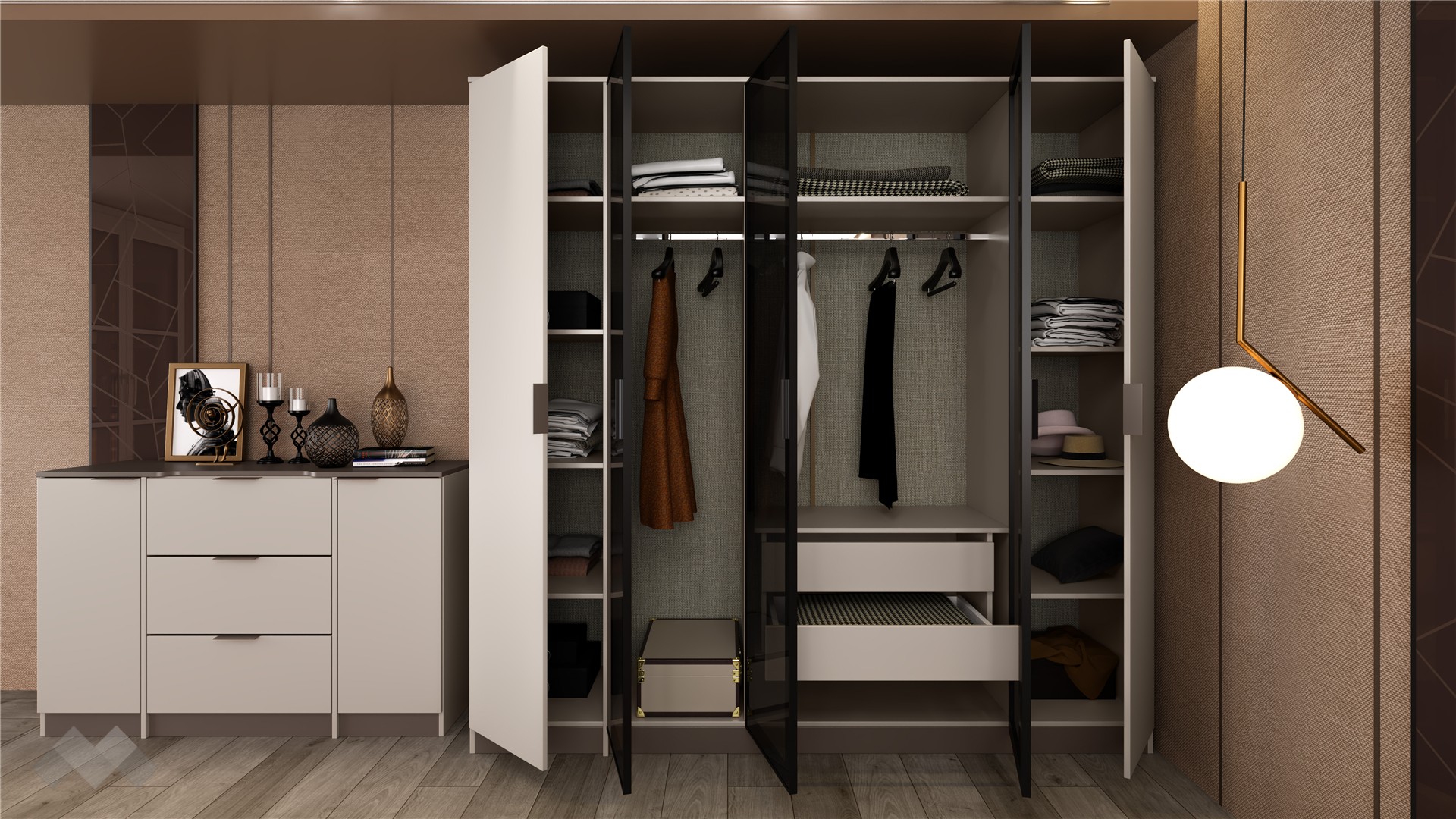 За перфектна организация на гардеробното пространство се грижи петкриленият гардероб с алуминиеви витрини, в които са вградени затъмнени рефлекторни стъкла – стилно и функционално решение, което съчетава модерна визия с практичност. Просторните рафтове, двете чекмеджета и лостът за закачалки осигуряват перфектната организация на дрехите.