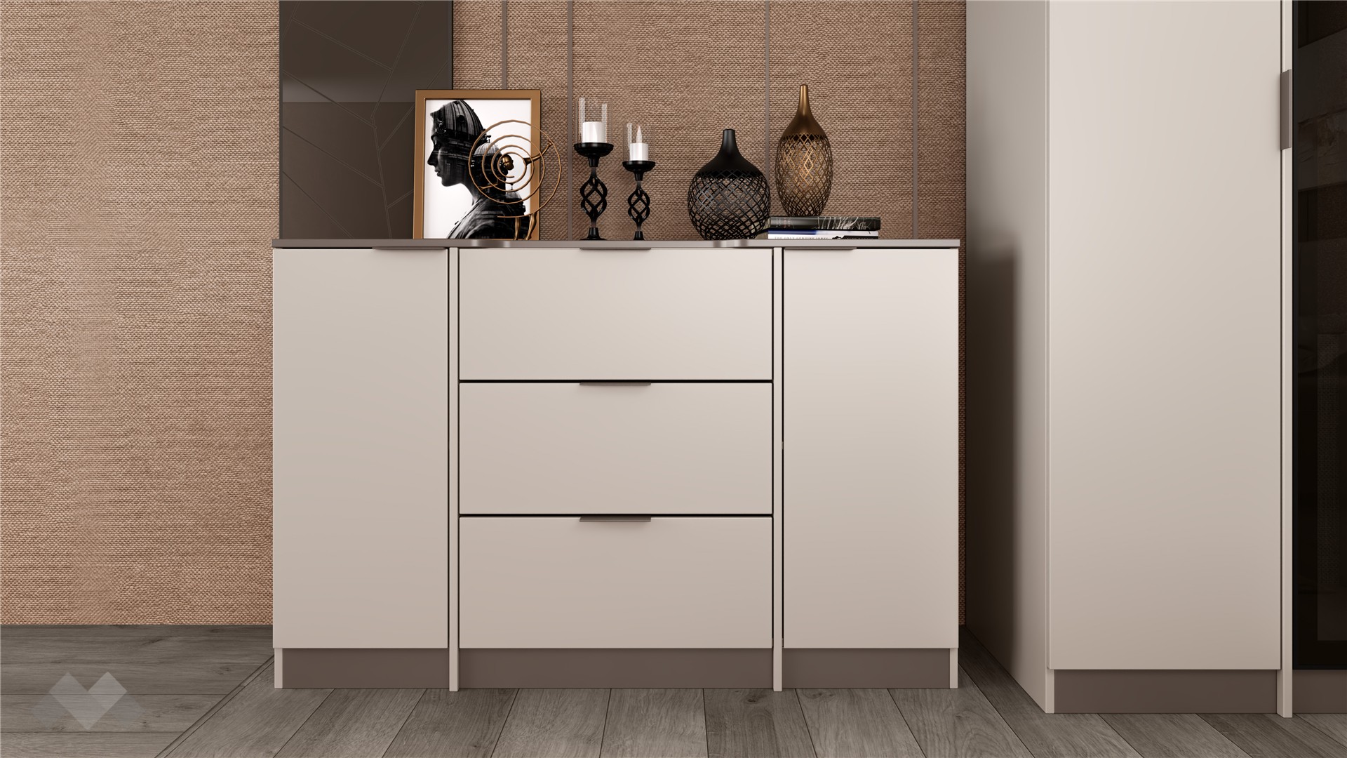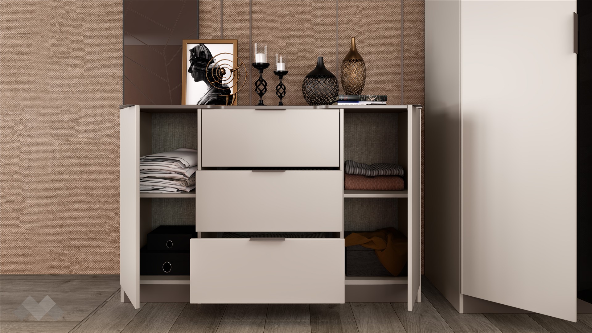 Скринът с два шкафа и три чекмеджета допълва комплекта, предоставяйки достатъчно място за съхранение на лични вещи, козметика и други. Чекмеджетата са снабдени със сачмени водачи с пълно изтегляне, които осигуряват пълен достъп до съдържанието и гарантират дълготрайна устойчивост.