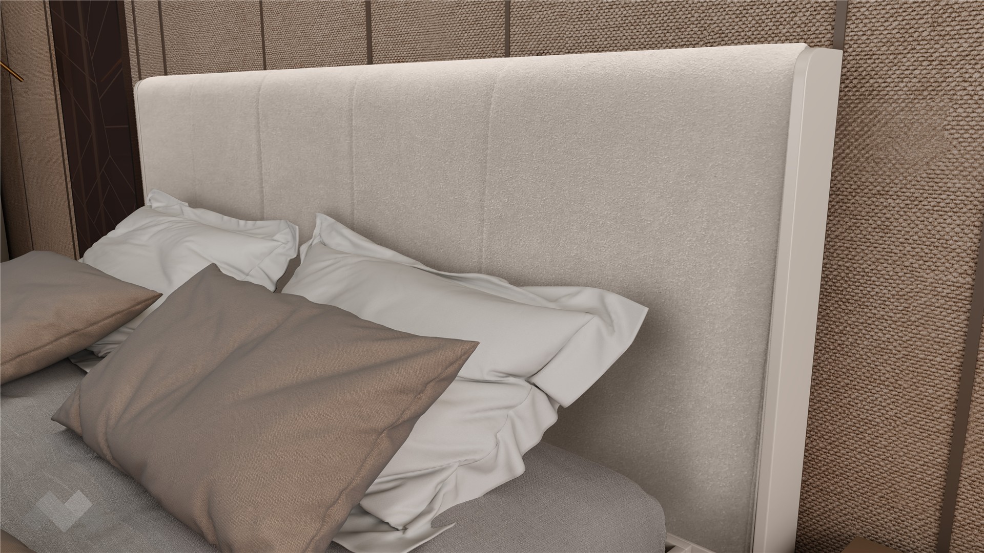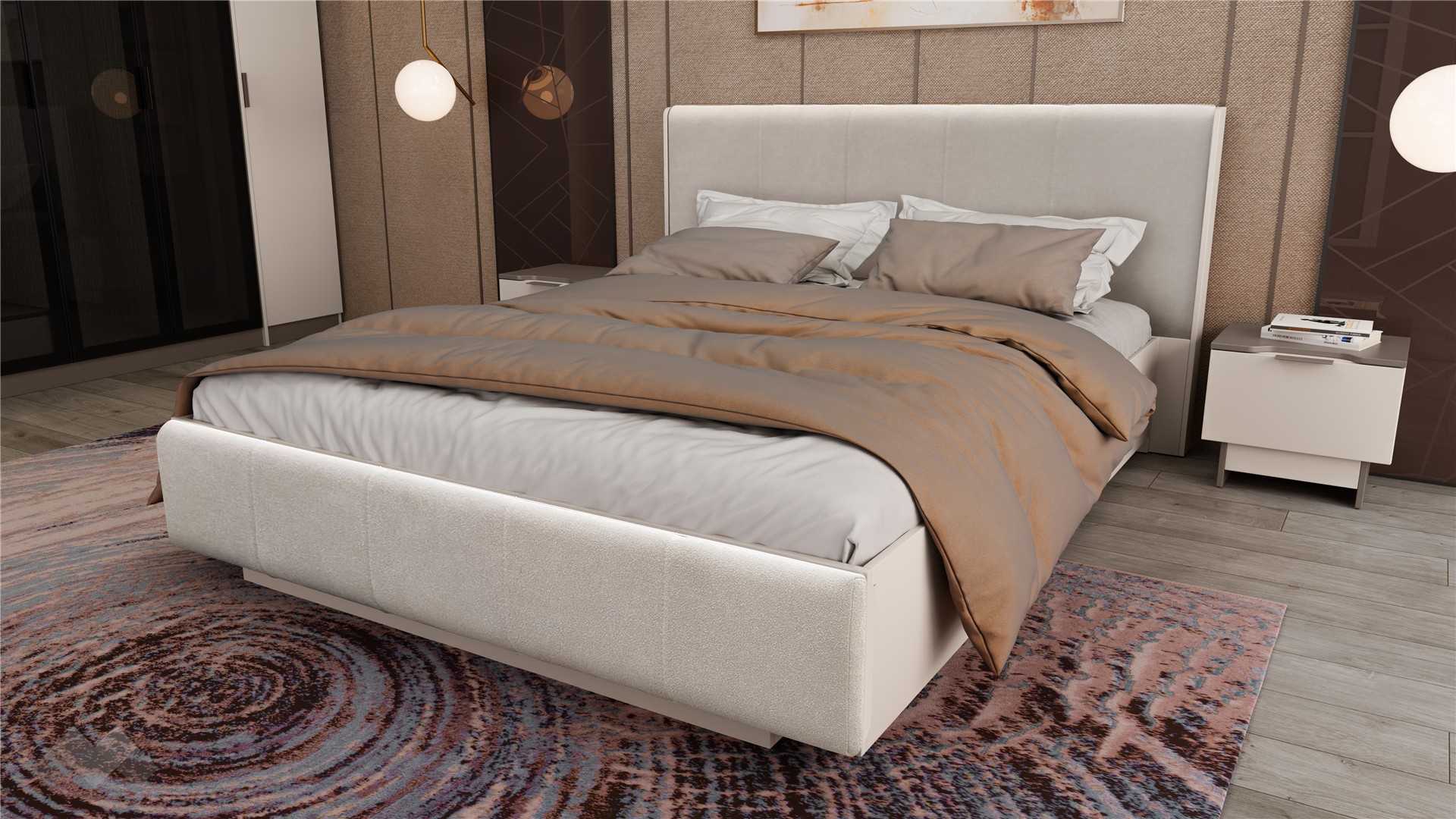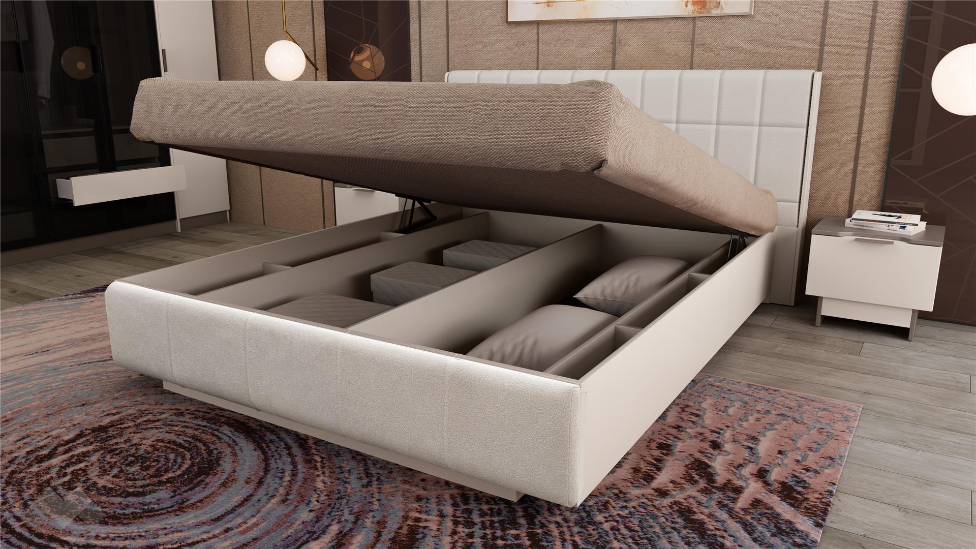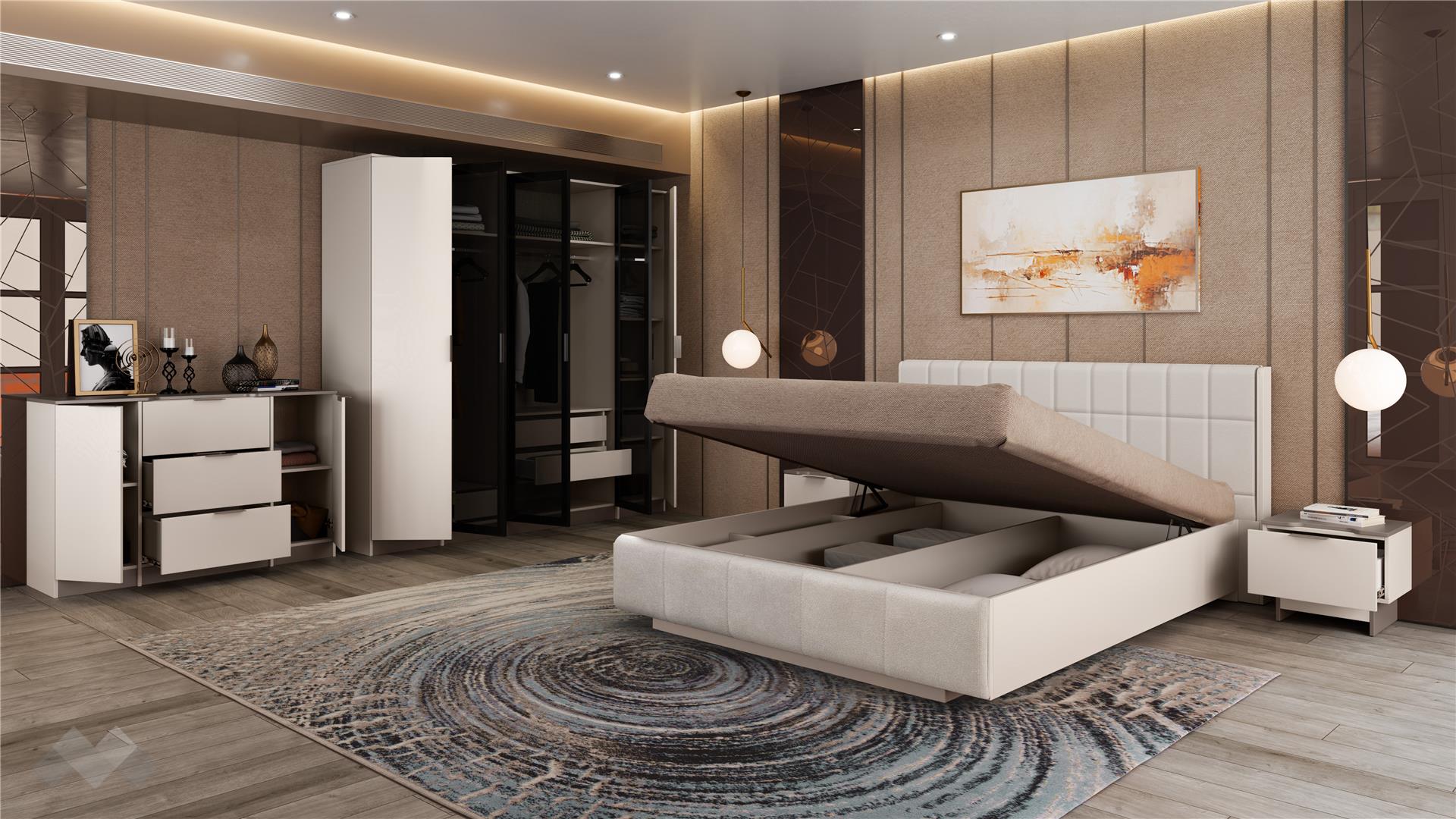 Основният акцент в комплекта е спалнята , която е предназначена за матрак 160/200 см. Тапицираната табла в светли тонове придава луксозен завършек и осигурява комфорт при четене или гледане на телевизия. Включеният повдигащ мехнизъм позволява лесен достъп до подматрачното пространство, предоставяйки практично място за съхранение на вещи и багаж, което е особено полезно в малки пространства.
