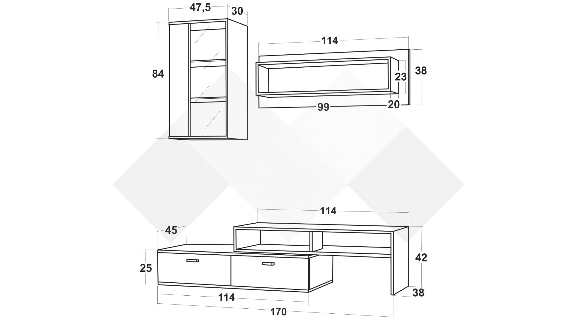 ТВ шкаф: Д: 170 см Ш: 45 см В: 42 см