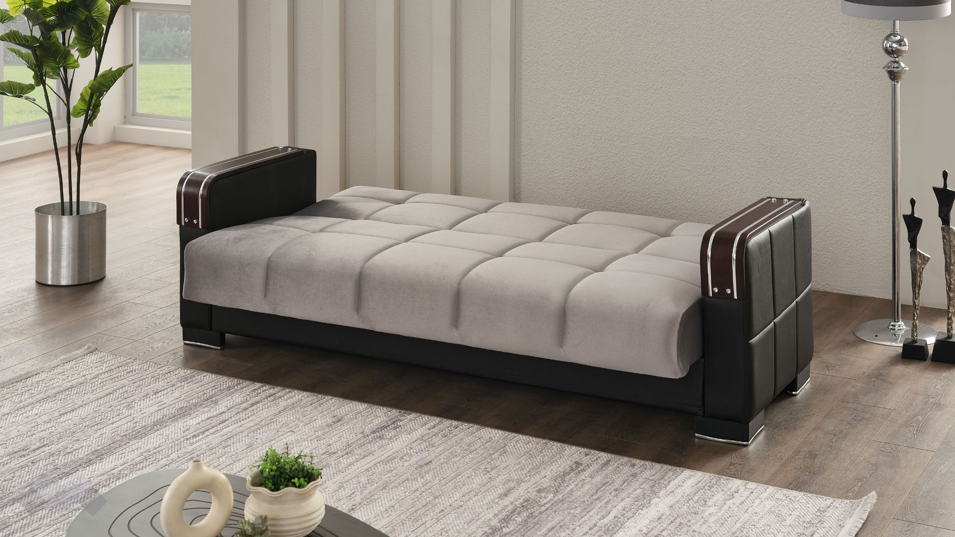 Диван Малатия е и функционален - благодарение на клик-клак механизма ще разполагаш с повече пространство за релакс - 112/190 см, а под седалката се крие удобна ракла, където да съхраняваш завивки, възглавници и други вещи. Дамаската е приятна на допир, изработена от здрав и устойчив текстил, а за още по изтънчена визия, подлакътниците са с покрити с матово-черна еко кожа.