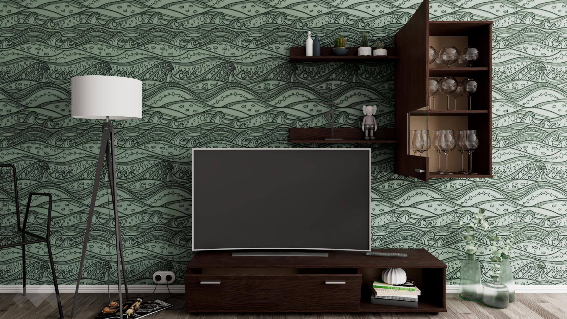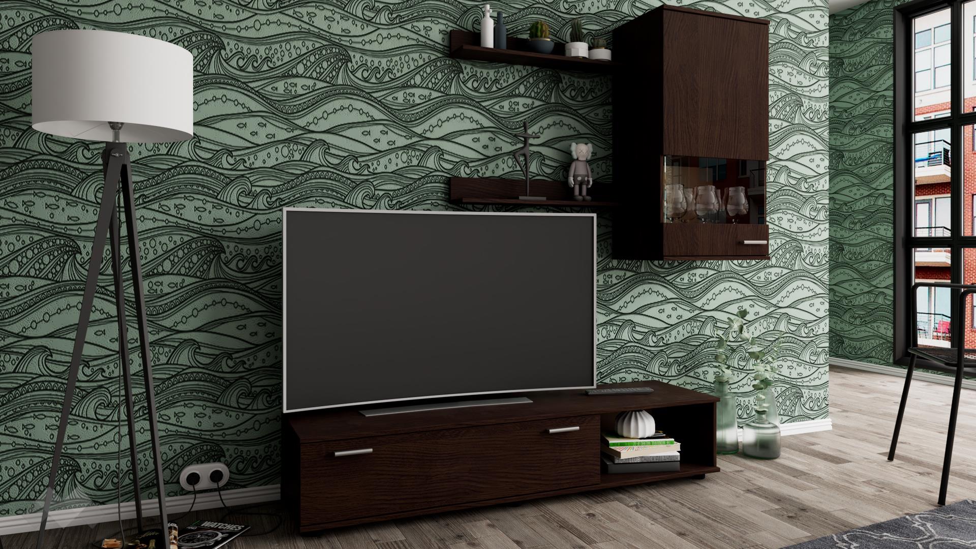 ТВ шкафът се състои от шкаф с падаща врата и отворена ниша. Там можеш да организираш цялата си съпътстваща техника като декодери, плеъри и конзоли. Окаченият шкаф ще приюти сервизите, които използваш най-често, за да са винаги на ръка разстояние. Двете етажерки са прекрасен начин да създадеш допълнително пространство за книги, скъпи спомени като фотографии или сувенири, а може и да аранжираш със стилни декорации и украси – изборът е твой!