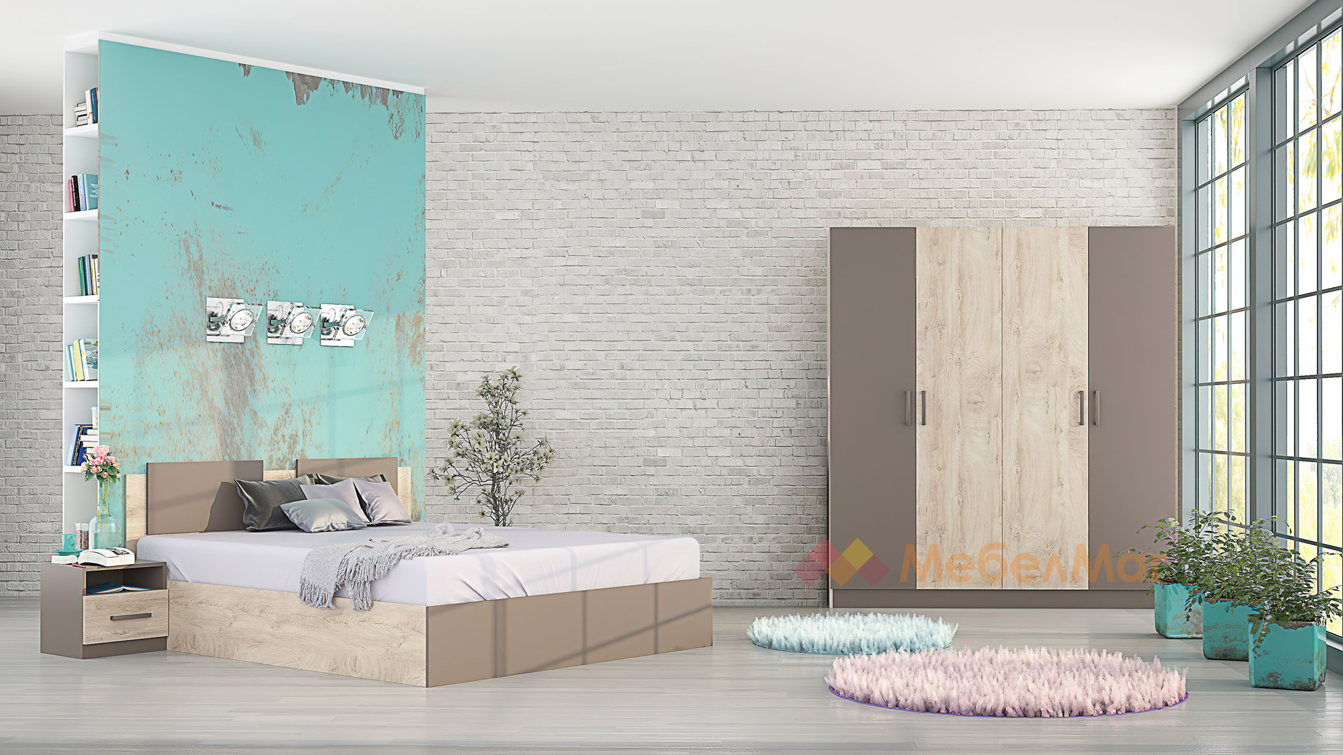 ✓ спалня ✓ 2 нощни шкафчета ✓ амортисьорен повдигащ механизъм ✓ четирикрилен гардероб ✓ механизъм за плавно затваряне ✓ модерна цветова комбинация ✓ качествена изработка ✓ 16 мм ПДЧ