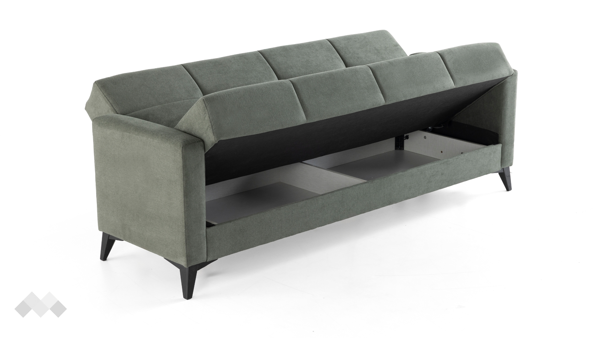 Дизайнът е изчистен и добре структуриран, като подлакътниците са стабилни – осигуряващи надеждна опора при сядане. Под седалката се намира удобна и дълбока ракла, в която можеш да съхраняваш всичко необходимо – спално бельо, възглавници, одеяла или сезонни вещи.