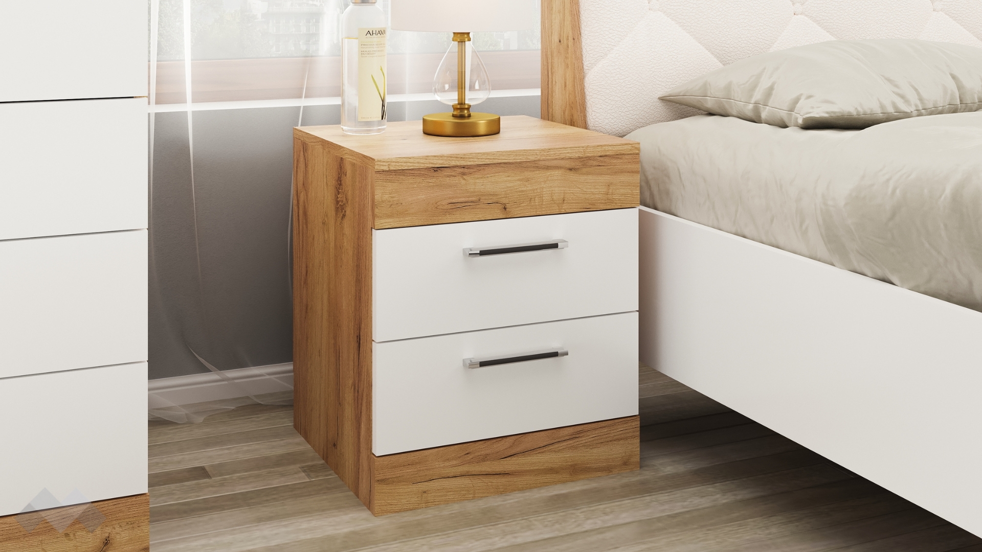 Нощен шкафМоникзлатен дъб с бяло