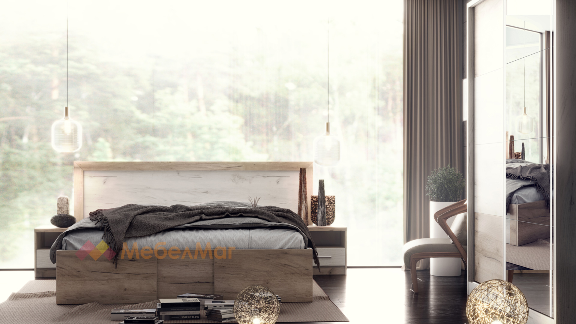 Спалнята е достатъчно голяма, за да ти предостави необходимото пространство за спокоен сън. Тя е подходяща за матрак с размер 160/200 см. или 180/200 см. (това го решаваш ти по време на монтажа). Нощните шкафчета са с по едно чекмедже и отворен рафт, готови да приютят най-необходимите ти вещи, за да са винаги на ръка разстояние.