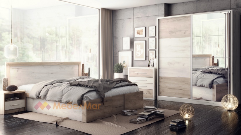 ✓ спалня с две нощни шкафчета ✓ механизъм за повдигане на матрака ✓ гардероб с огледала ✓ скрин ✓ качествена изработка ✓ модерен дизайн ✓ 16 мм ПДЧ