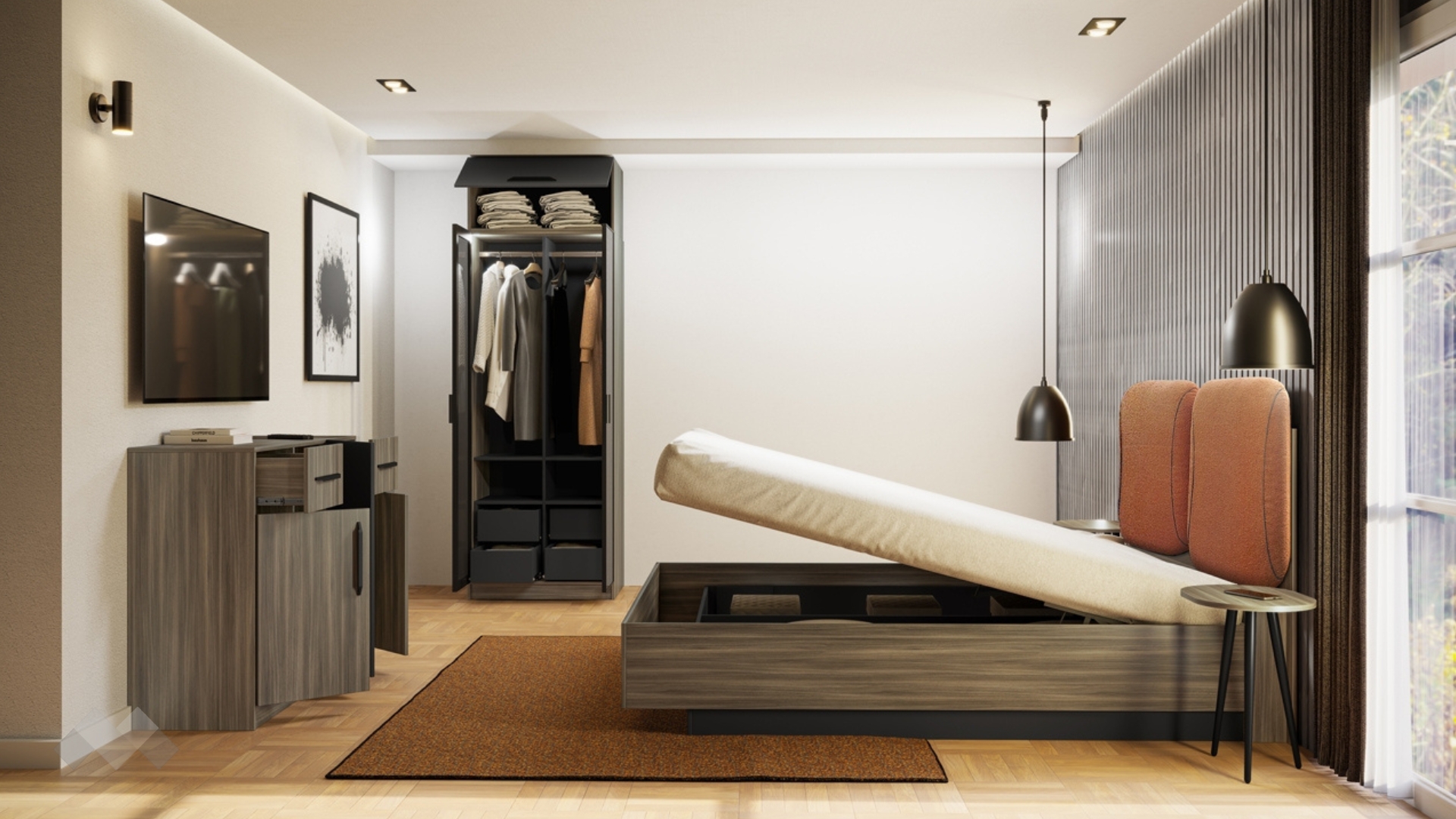 Спалнята е подходяща за матрак с размери 160/200 см . Тя ще те впечатли с изчистен и елегантен дизайн, който внася усещане за уют и хармония в помещението. Тапицираната табла, облечена в мека и приятна на допир дамаска, създава изключителен комфорт при облягане — перфектна за моменти на релакс с книга или сутрешно кафе в леглото. Благодарение на включения механизъм за повдигане на матрака ще разполагаш с допълнително място за съхранение на вещите си.