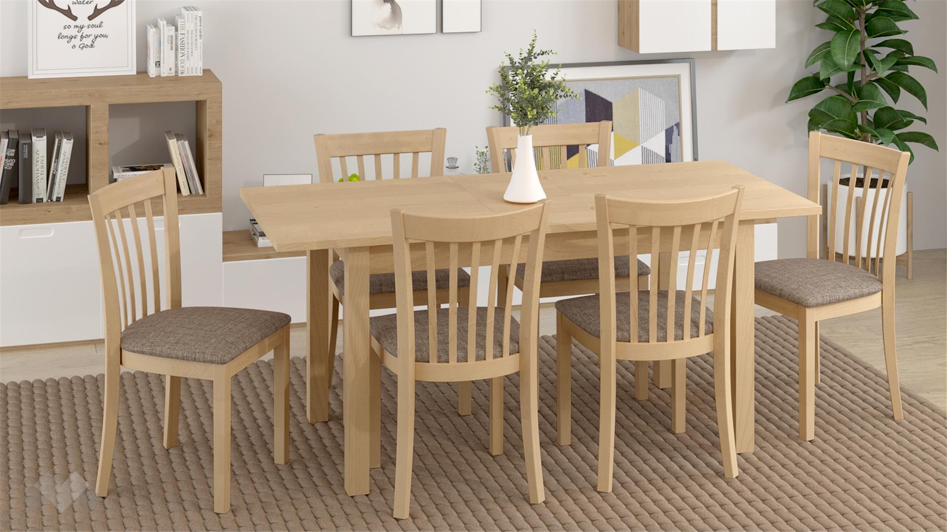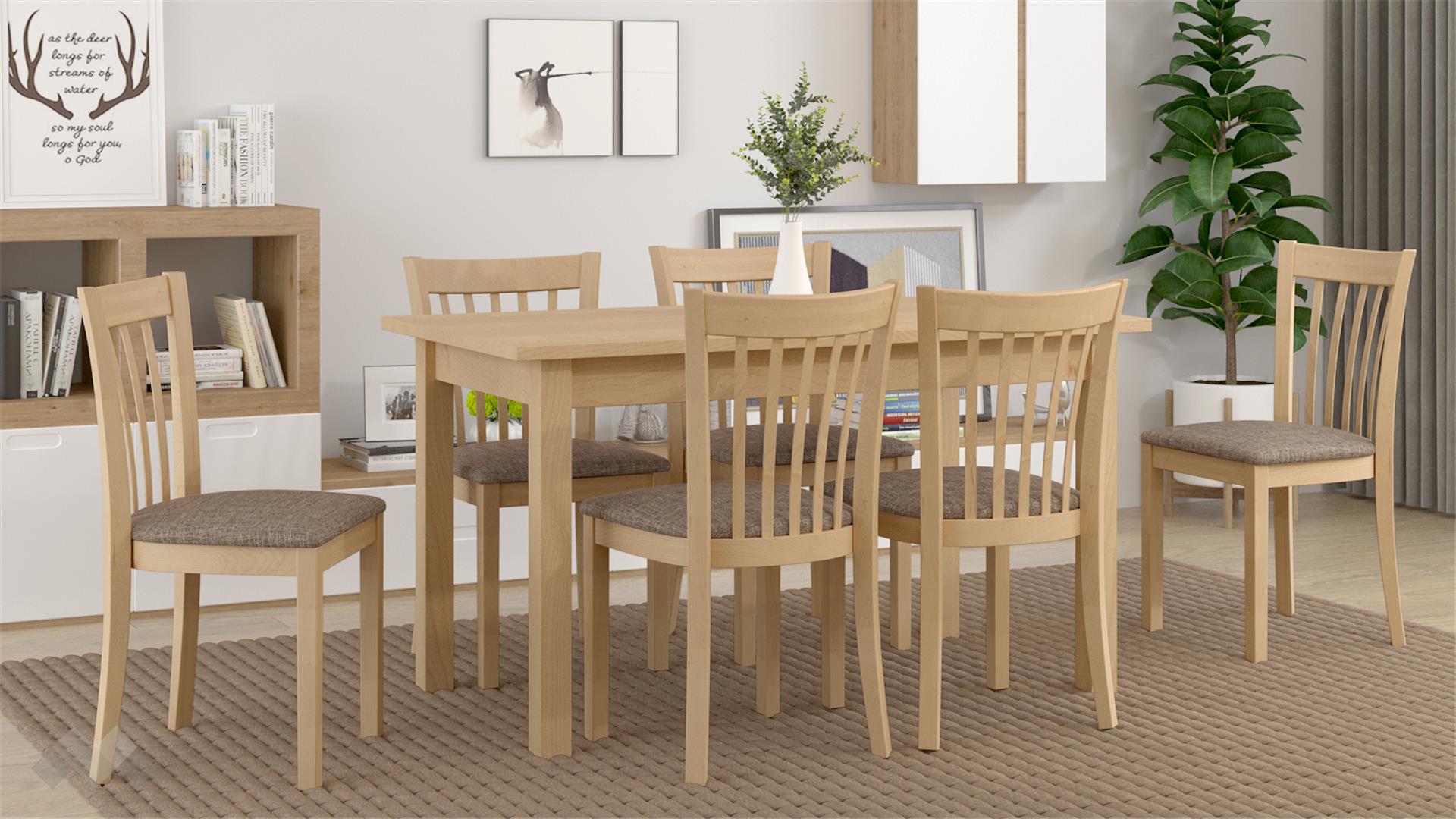 Трапезен комплект Нати L разполага с маса с дължина 130 см и 6 стола. Комплектът е изработен от масивна дървесина. А когато се нуждаеш от повече място, масата се разтяга до 158 см. Столовете са също толкова здрави и стабилни. Седалната част е достатъчно мека, за да ти е комфортно и в същото време удобно за хранене.