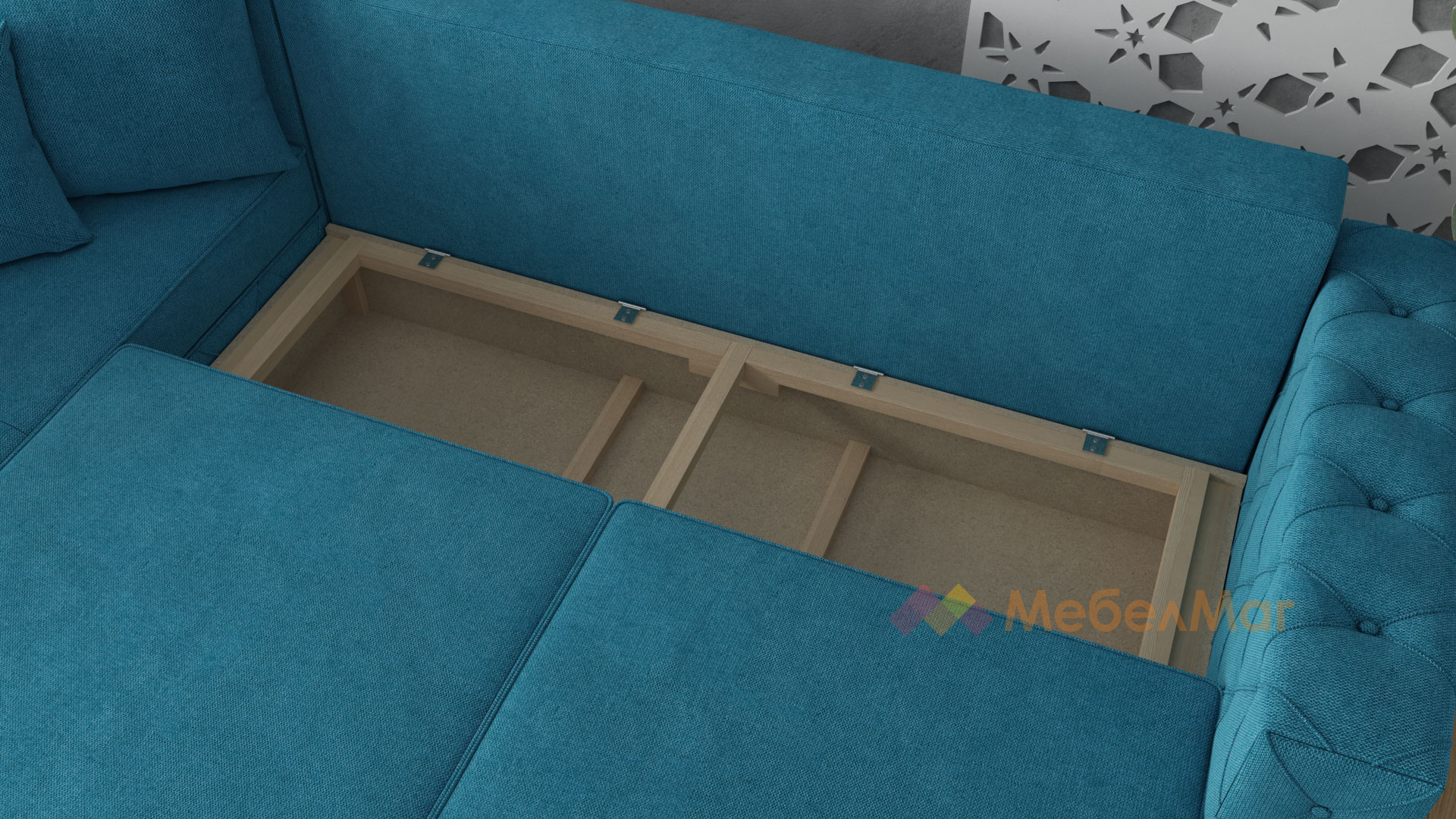 Впечатляващо при ъглов диван Нептун е пространството за сън с размери 147/244 см, достъпно посредством падащ гръб, под който има ракла за съхранение на вещи или завивки.