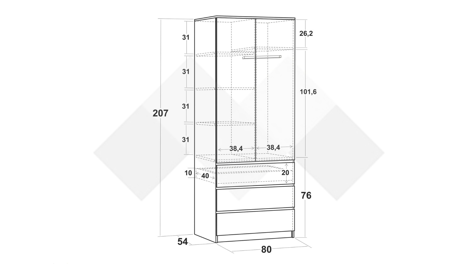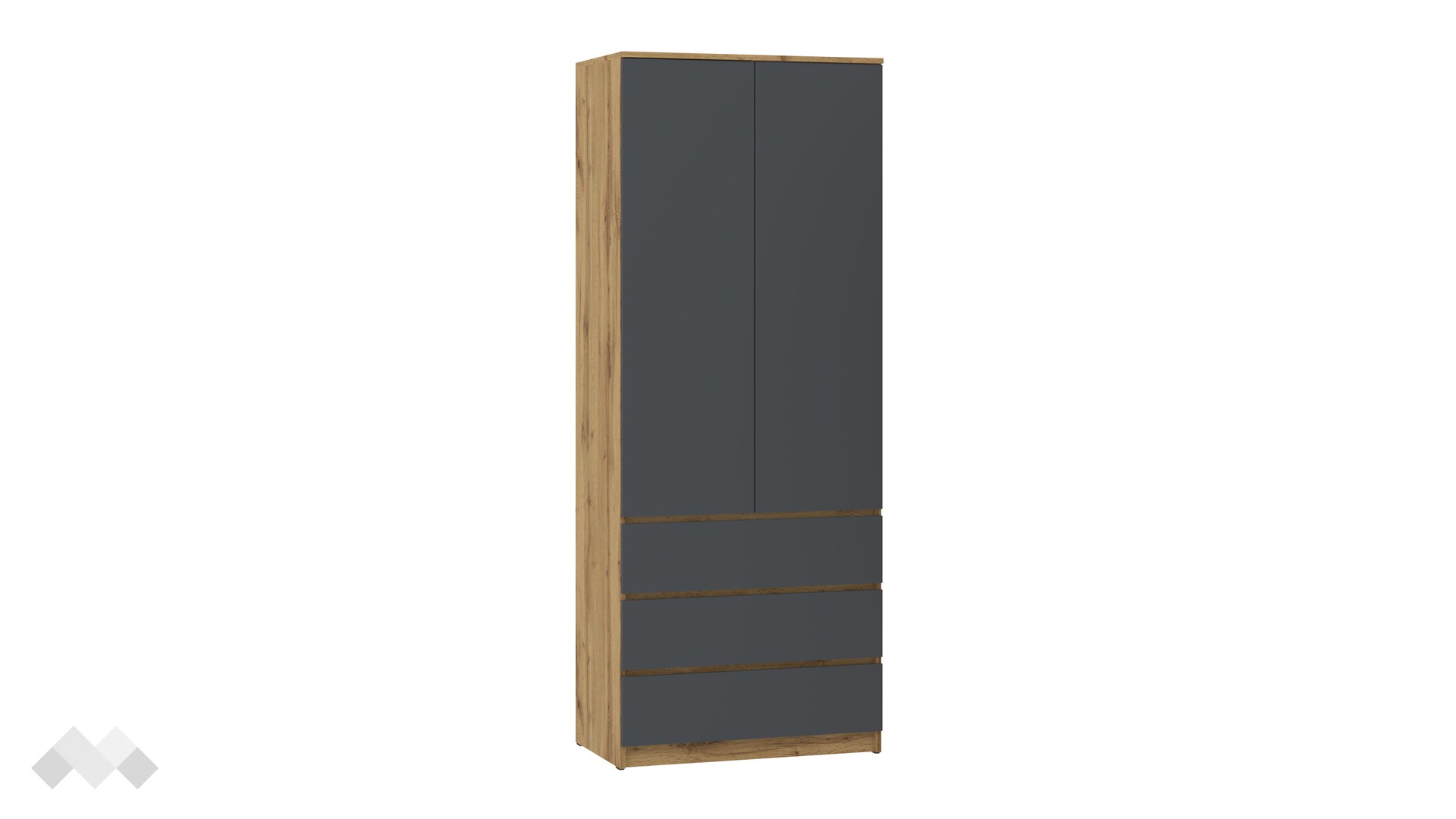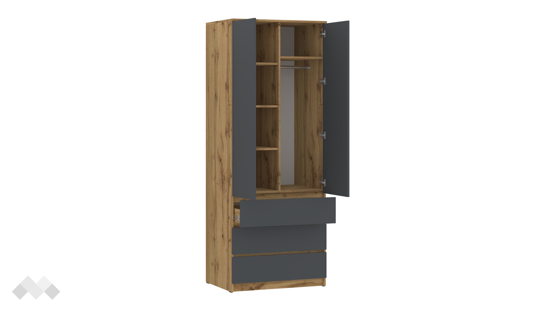 ✓ двукрилен ✓ 4 рафта ✓ 3 чекмеджета ✓ лост за закачалки ✓ телескопични водачи ✓ модерен декор ✓ практично разпределение ✓ качествена изработка