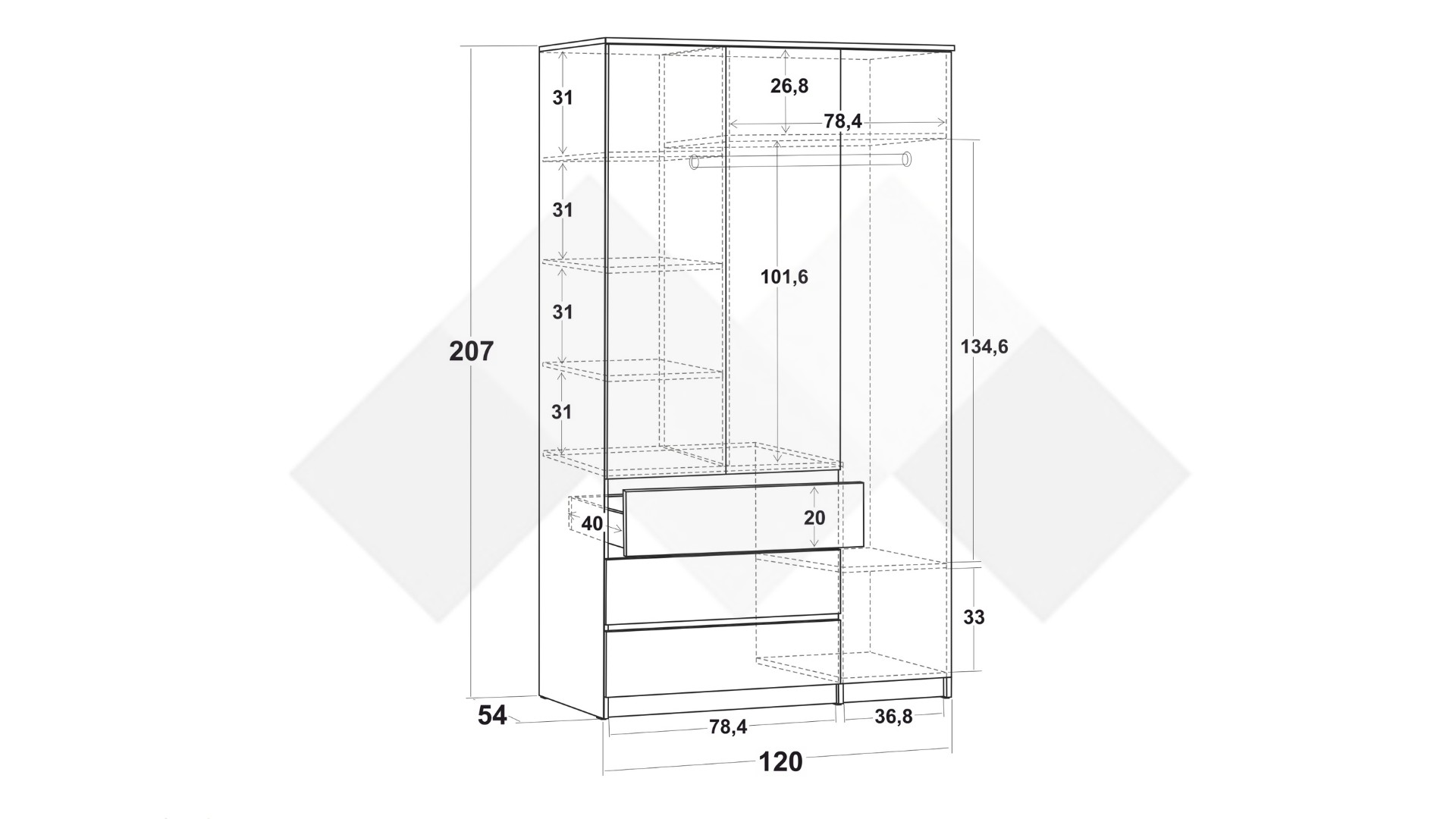 Той ще те впечатли с функционално разпределение, което ще ти позволи да подредиш добре всички дрехи и аксесоари. Благодарение на изчистения и модерен дизайн, този гардероб би се вписал във всеки интериор. Всяка дреха ще намери своето подходящо място, а ежедневният избор на тоалет ще се превърне в лесен и приятен ритуал, който няма да отнема от времето ти.