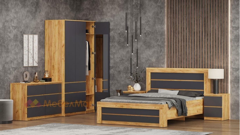 ✓ спалня с акцентна табла ✓ трикрилен гардероб ✓ скрин с 6 чекмеджета ✓ 2 броя нощни шкафчета ✓ елегантен дизайн ✓ качествена изработка ✓ 16 мм ПДЧ