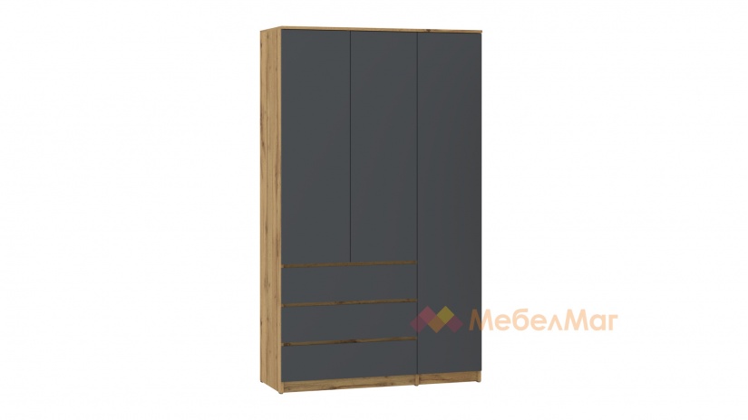 Трикрилният гардероб съчетава елегантен дизайн и функционалност. Той осигурява достатъчно място за дрехи и аксесоари. Идеален за всяка спалня, този гардероб добавя нотка изисканост и ред. Той ще те впечатли с функционално разпределение, което ще ти позволи да подредиш добре всички дрехи и аксесоари. Зад крилата ще намериш широко пространство, седем рафта и лост за закачалки, където да съхраниш ризи, сака или по-обемни дрехи като палта. В долната си част гардеробът изненадва с нестандартно решение от три големи чекмеджета, където можеш да организираш бельо, чорапи, малки електроуреди или друг вид вещи, нуждаещи се от място. Изненадата в гардероба е огледалото, което се намира зад вратичката, с помощта на което лесно ще можеш да подбереш тоалета си. Още едно предимство, с което разполага гардероба, са телескопичните водачи на чекмеджетата - те са по-здрави и издържливи във времето.