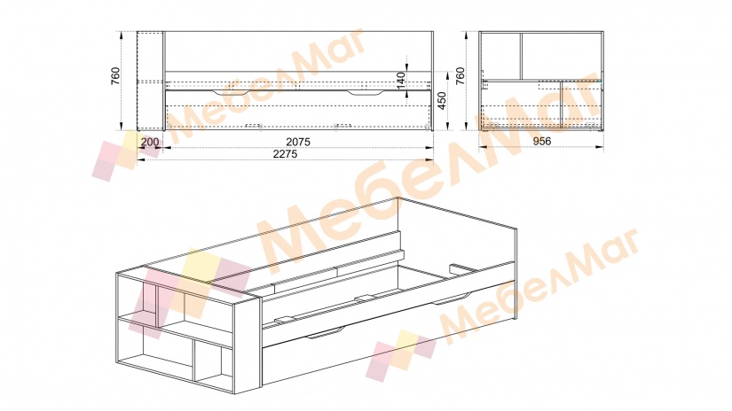 Леглото е с размер 90/200 см - достатъчно голямо, за да предостави необходимия комфорт за сън. Допълнителна екстра, към това функционално легло е включената етажерка – там може да подредиш книги, играчки или други вещи на детето.