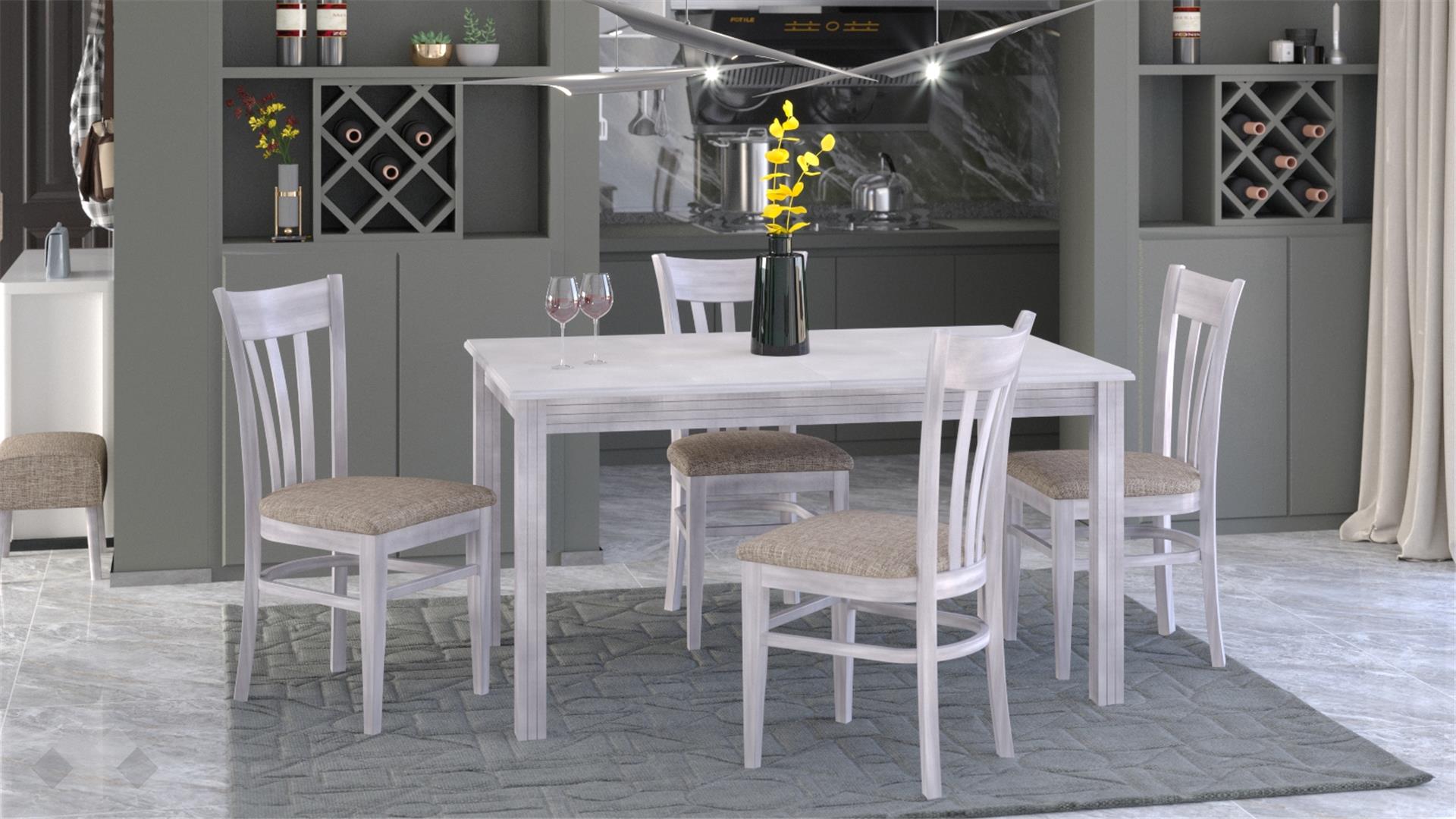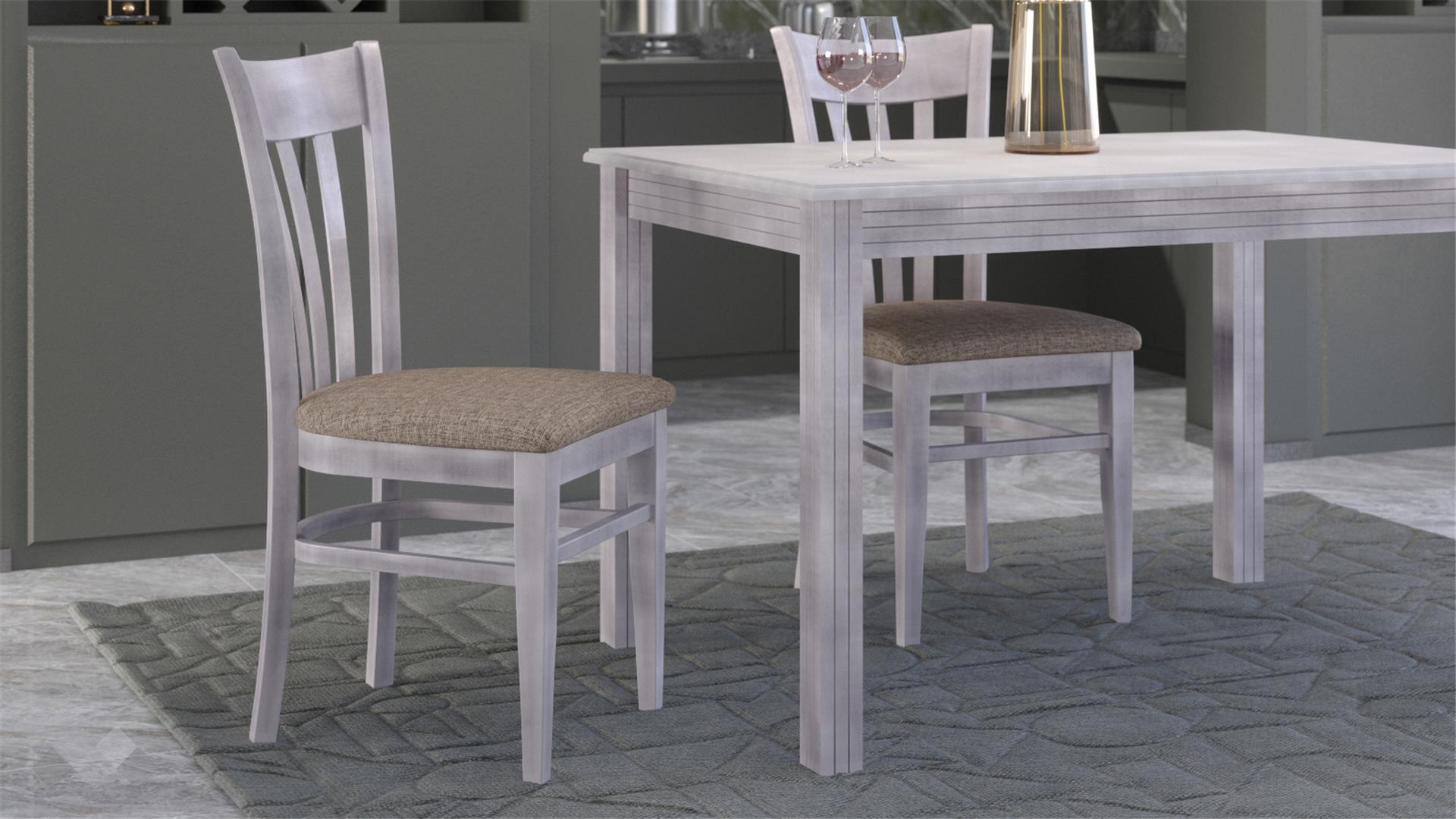 Столът е със здрава конструкция от естествена букова дървесина за устойчивост и стабилност, а лаковото покритие добавя елегантност. Седалката е проектирана с твърда основа, тапицирана с дунапрен за повече комфорт при седене и завършен със здрава текстилна дамаска, лесна за поддръжка.