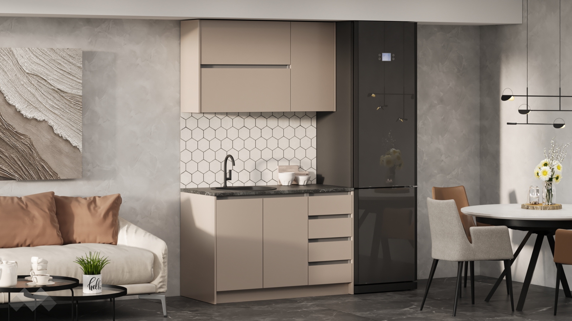 Елегантната комбинация от кашмир със сиво и плот в декор - тъмен бетон,придава изискан характер, а функционалните шкафове и чекмеджета осигуряват достатъчно място за всичко необходимо.