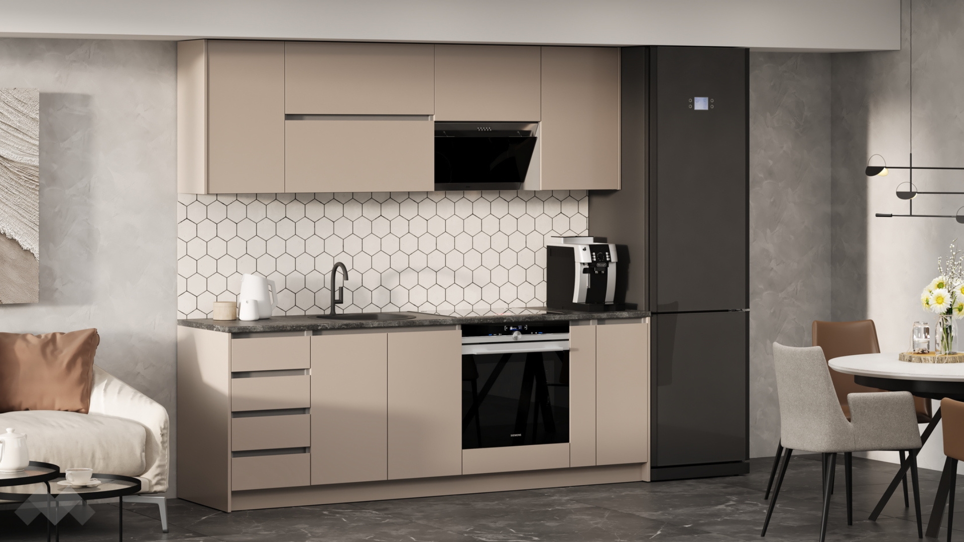Елегантната комбинация от кашмир със сиво и плот в декор - тъмен бетон,придава изискан характер, а функционалните шкафове и чекмеджета осигуряват достатъчно място за всичко необходимо.