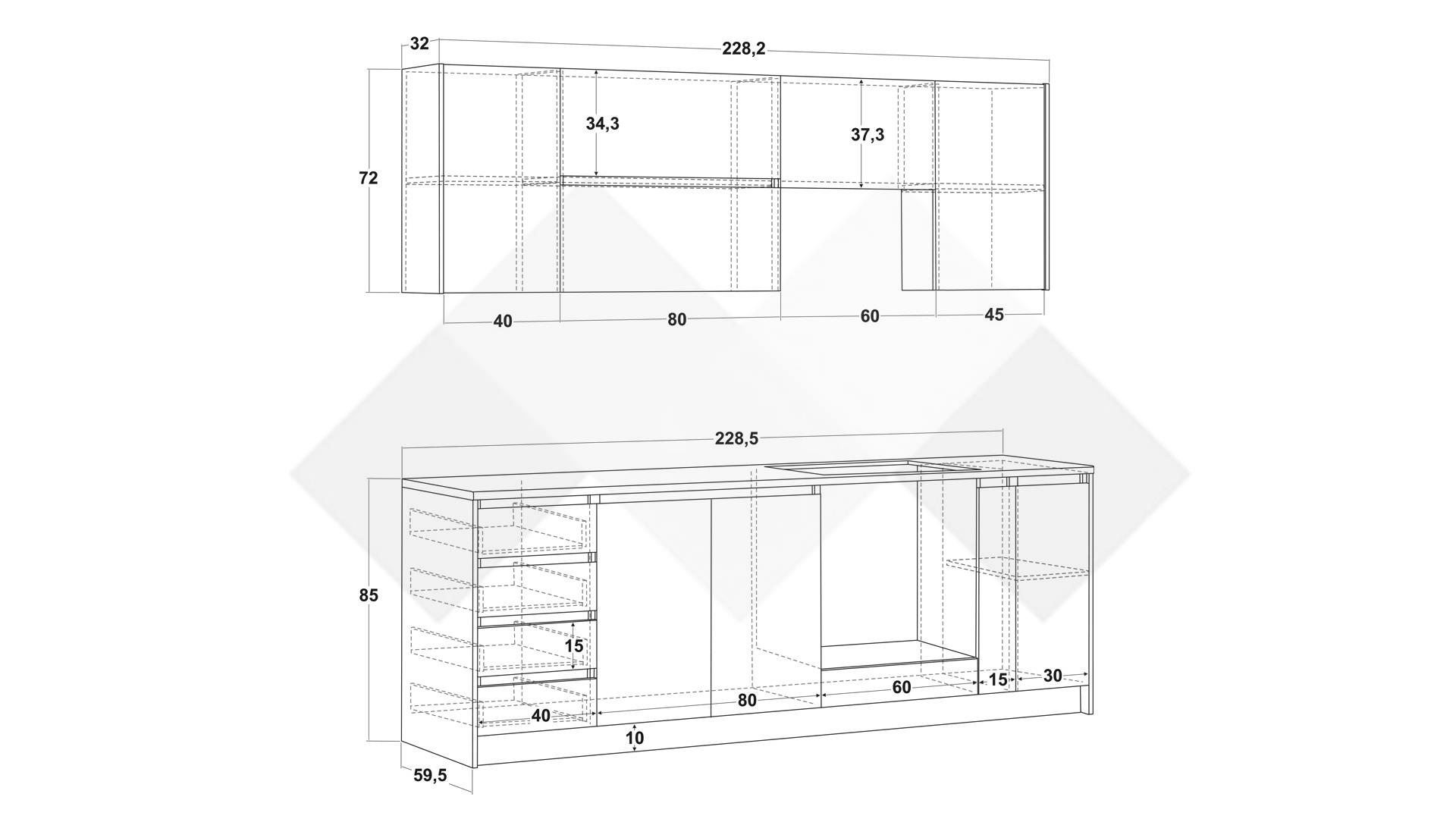 Горен модул: Д: 228,2 см. Ш: 32 см. В: 72 см.