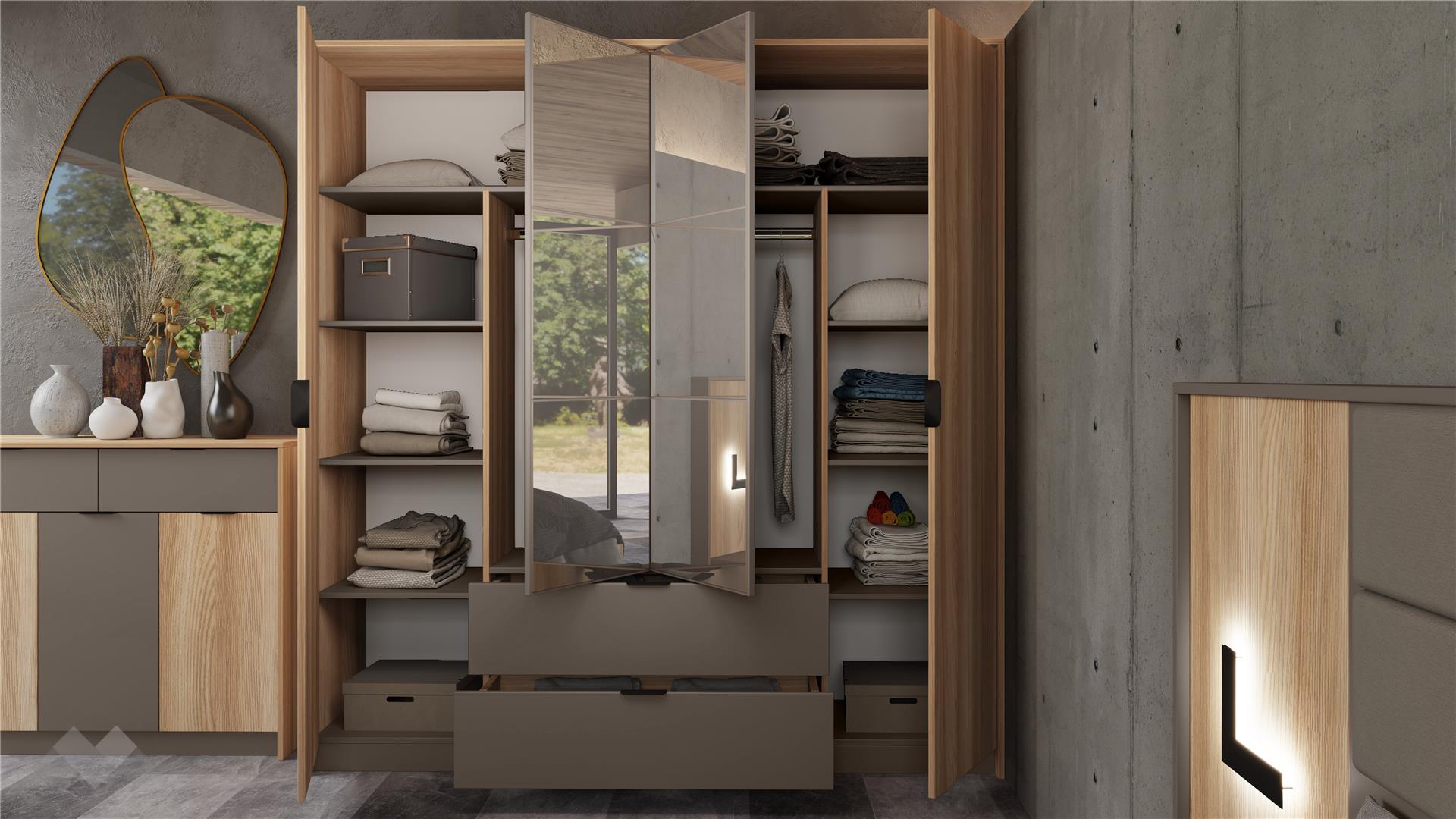 Четирикрилният гардероб е проектиран с мисъл за практичност. Той разполага с рафтове, лостове за закачалки и две чекмеджета за по-дребни вещи, предоставяйки отлично организирано вътрешно пространство. Двойното огледало, съставено от няколко ефектни части, придава стил и визуално разширява помещението.