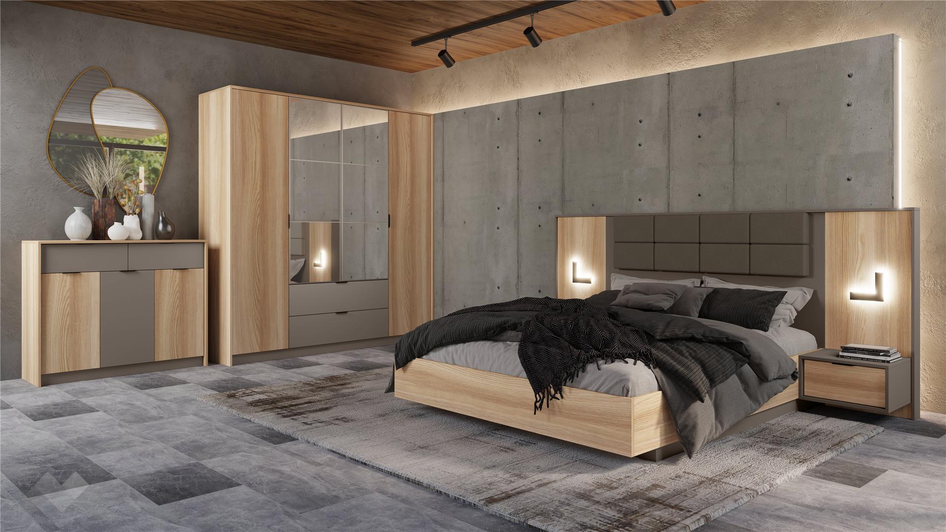✓ 18 мм ПДЧ ✓ спалня за матрак 160/200 ✓ четирикрилен гардероб с две чекмеджета ✓ скрин с три врати и две чекмеджета ✓ две нощни шкафчета ✓ модерен и хармоничен дизайн
