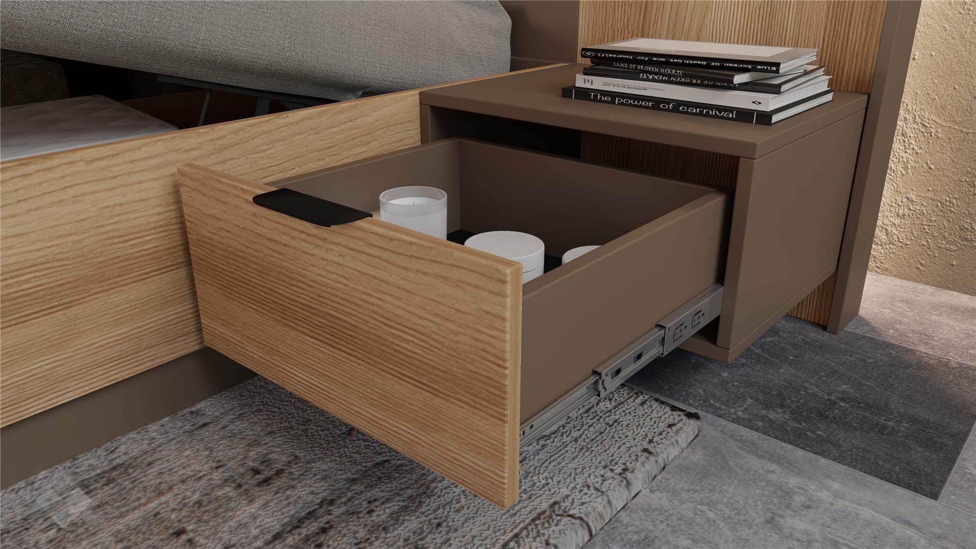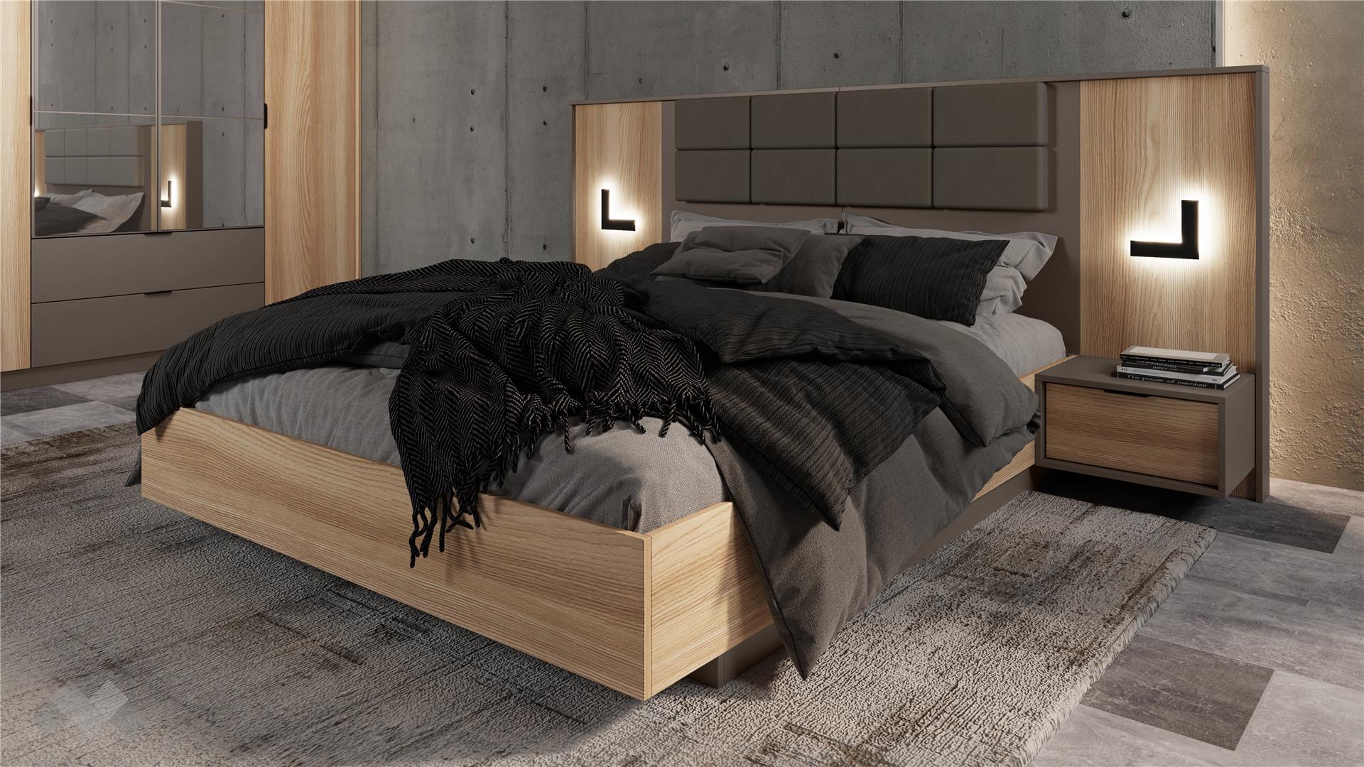 Спалнята се отличава с високи лубове, които с монтиран матрак осигуряват удобна височина за сядане от 51-53 см, и е подходяща за матрак с размери 160/200 см. Тапицираната табла с капучино дамаска, висока 120 см, добавя стилен акцент и предлага комфорт за четене или почивка. Вграденото LED осветление създава уютна и релаксираща атмосфера. Включеният повдигащ механизъм позволява оптимално използване на пространството под матрака за съхранение на багаж и дребни вещи.