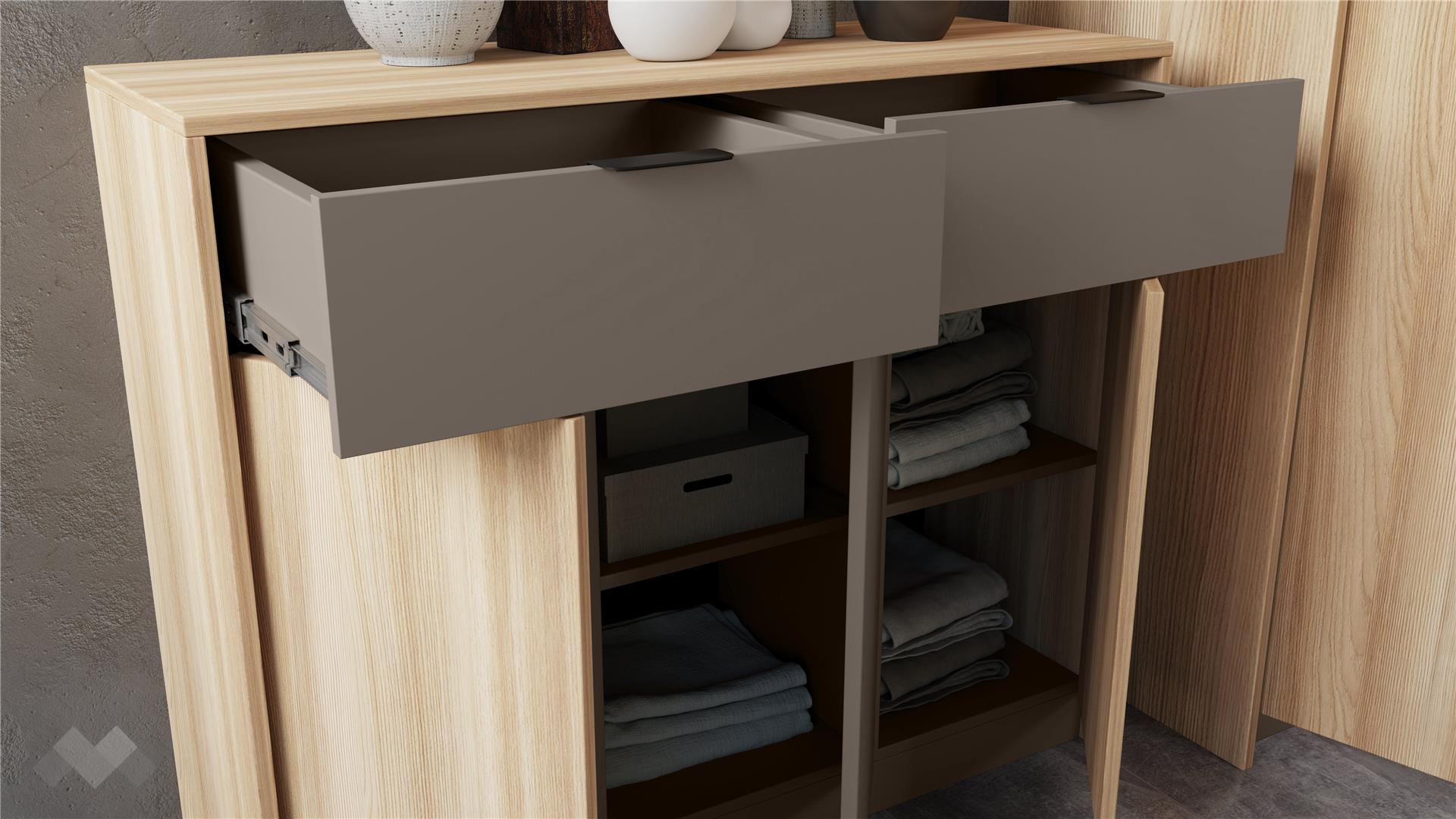 Скринът с три врати и две чекмеджета предлага обширно място за съхранение. Вратите имат механизми за плавно затваряне, които осигуряват тишина и удобство при употреба. Чекмеджетата са снабдени с телескопични сачмени водачи и се изтеглят до край за лесен достъп до съдържанието, като същевременно гарантират дълготрайна устойчивост.