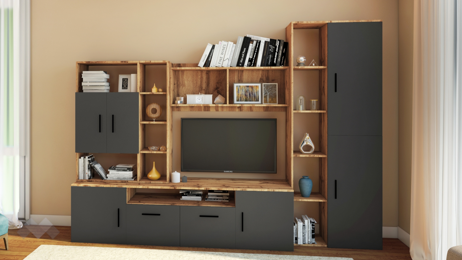 ⭐ Предимства: ✓ множество шкафове ✓ голямо и функционално място за съхранение ✓ модерен и стилен дизайн ✓ висок шкаф ✓ етажерки ✓ ТВ шкаф с място за ТВ 100/70 см ✓ открити рафтове ✓ механизъм за плавно затваряне ✓ качествена изработка ✓ 16 мм ПДЧ