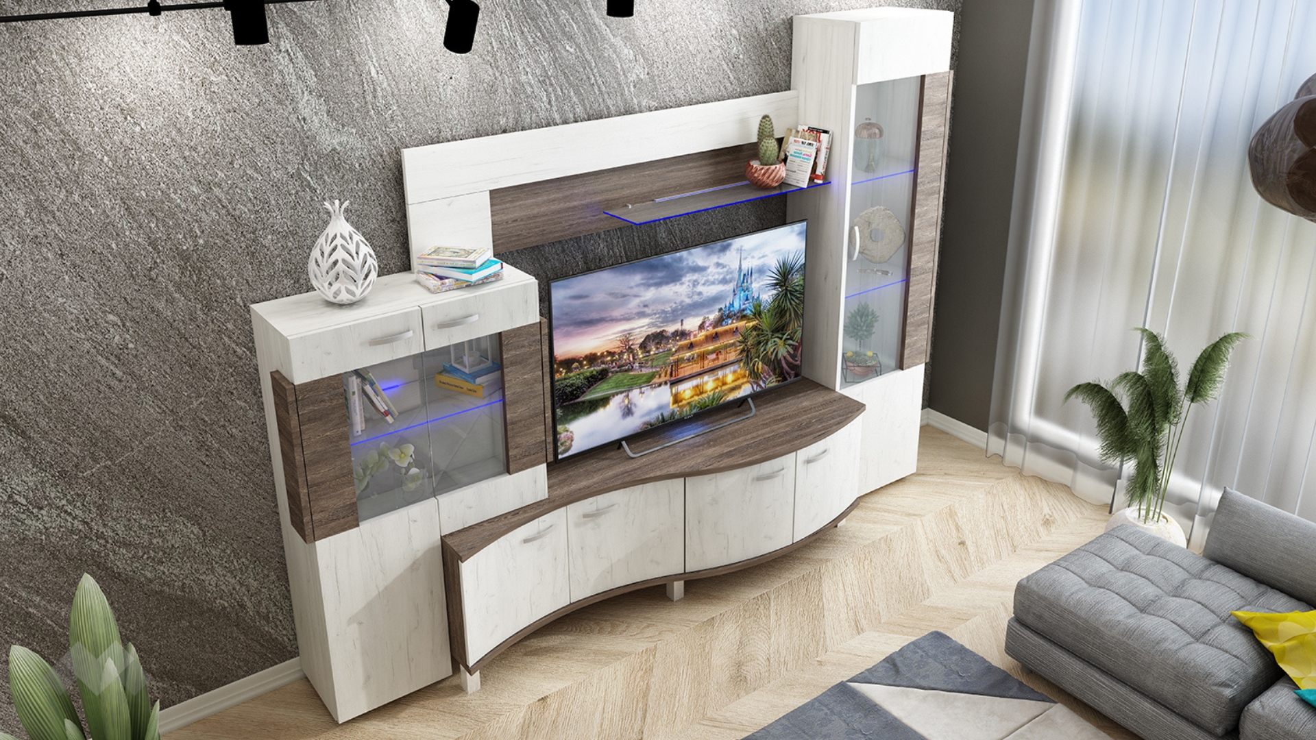 ⭐ Предимства: ✓ модерна цветова комбинация ✓ множество шкафове ✓ голямо и функционално място за съхранение ✓ луксозен дизайн ✓ висок шкаф ✓ стъклени рафтове ✓ остъклени врати ✓ етажерка ✓ ТВ шкаф с място за ТВ - 118/47/75 см ✓ LED осветление ✓ качествена изработка ✓ 16 мм и 18 мм ПДЧ