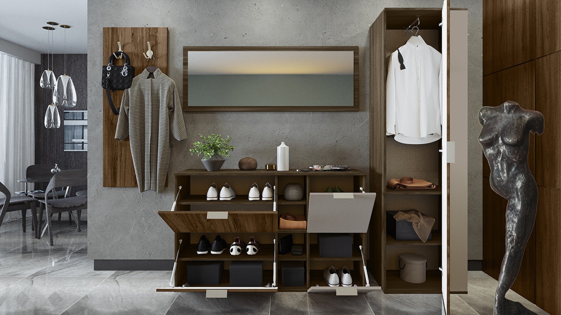 ✓ 18 мм МДФ и 16 мм ПДЧ ✓ практичен дизайн ✓ висок шкаф с врата ✓ изтеглящ лост за закачалки ✓ шкаф за обувки ✓ падащи врати ✓ огледало ✓ закачалка ✓ изчистени линии ✓ модерен декор ✓ качетсвена изработка
