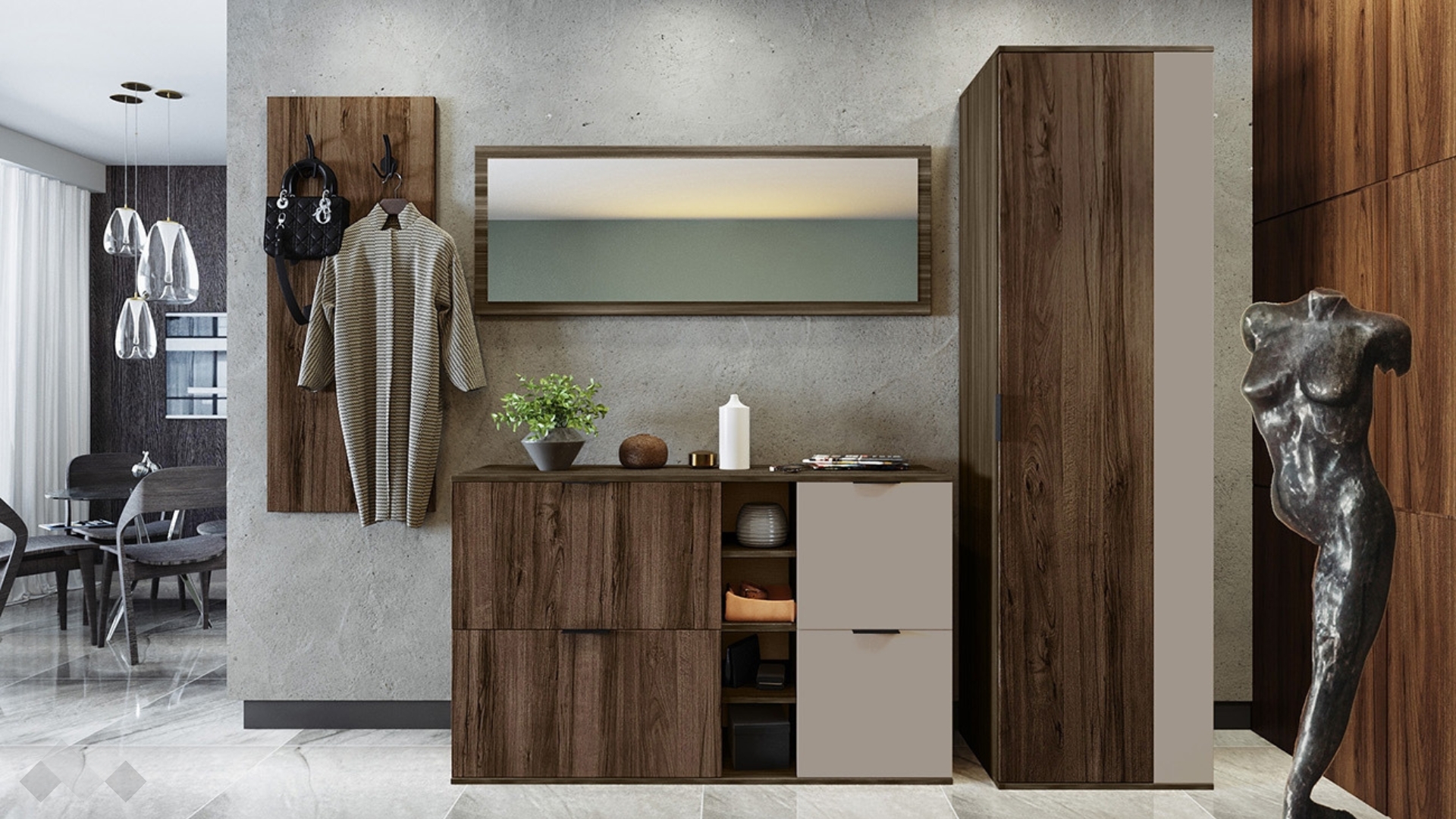 ⭐ Предимства: ✓ 18 мм МДФ и 16 мм ПДЧ ✓ практичен дизайн ✓ висок шкаф с врата ✓ изтеглящ лост за закачалки ✓ шкаф за обувки ✓ падащи врати ✓ огледало ✓ закачалка ✓ изчистени линии ✓ модерен декор ✓ качетсвена изработка