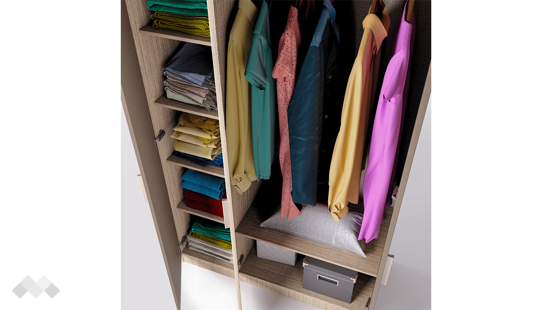 Гардероб Провидънс се състои от лост и рафт зад двете врати, както и 4 рафта в третото крило. Друго предимство е централното огледало, което не само че прави стаята по-осветена, но и е верен помощник в избора на тоалет всеки ден. Гардеробът има уникално разпределение, което ще ти позволи да подредиш добре всички дрехи и аксесоари.