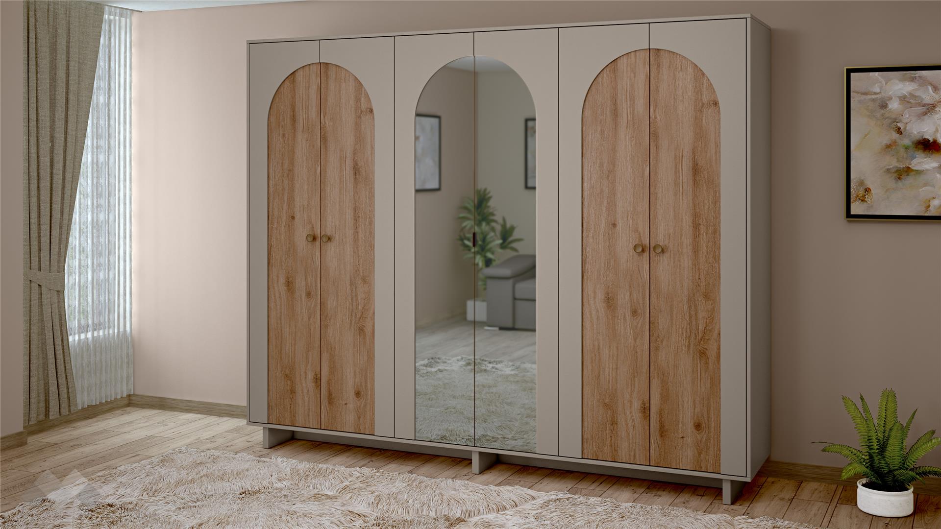 Гардеробът е с шест врати, зад които се крият общо пет рафта и два лоста за закачалки. Достатъчно пространство, за да прибереш както сгънати дрехи, така и такива, които не желаеш да се намачкват, за да са готови за обличане. Средните две врати са с огледала, за да огледаш визията си финално.