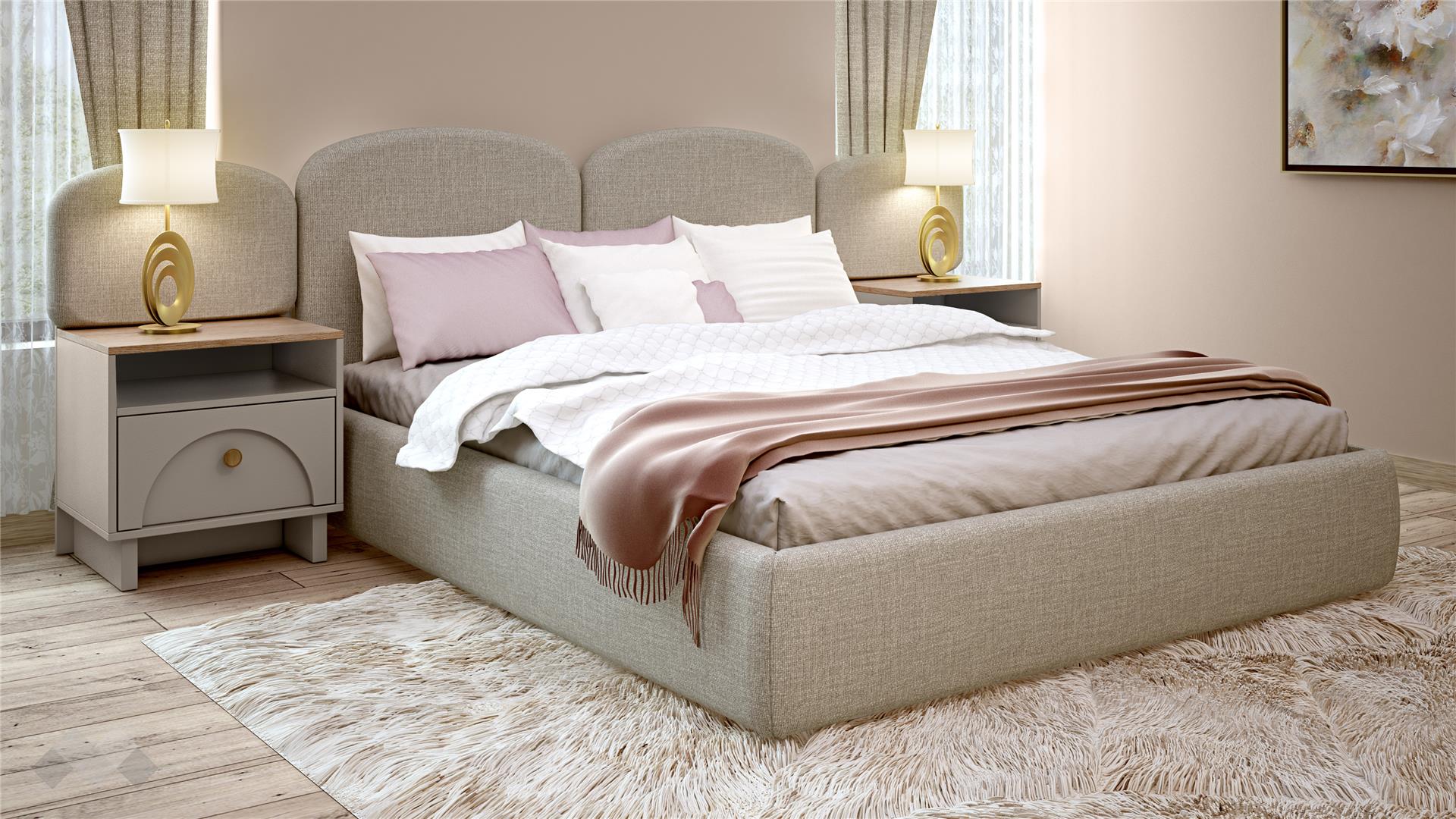 ✓ 18 мм ПДЧ ✓ тапицирана спалня ✓ мека тапицирана табла ✓ 2 нощни шкафа ✓ механизъм за плавно затваряне ✓ модерен бохемски декор ✓ качествена изработка
