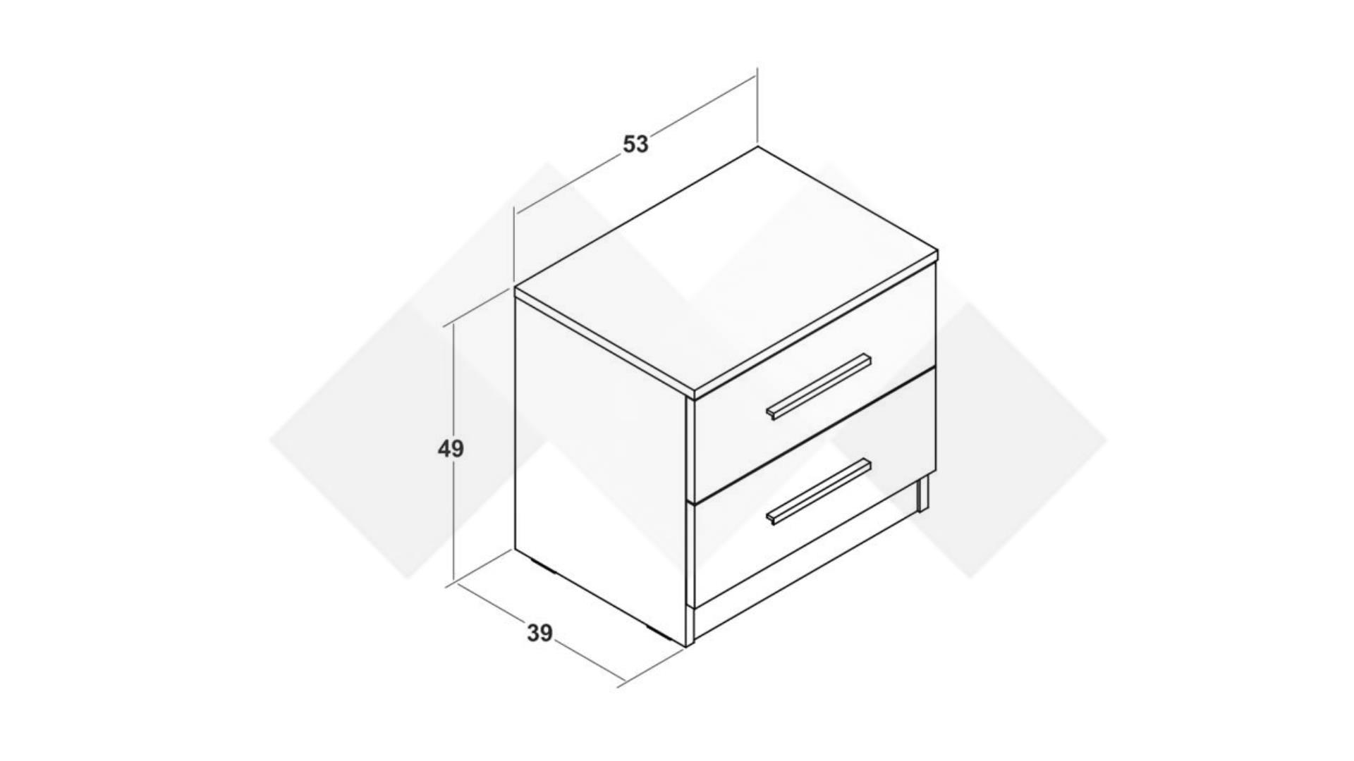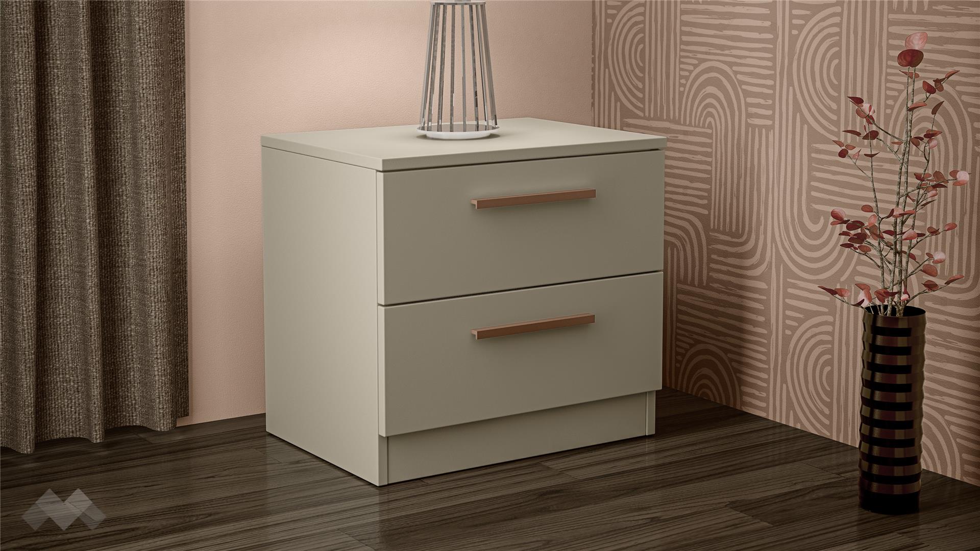 Шкафът разполага с две просторни чекмеджета, осигуряващи достатъчно място за съхранение на книги, очила, електронни устройства и други лични вещи, които да са винаги под ръка. Дръжките на чекмеджетата са в розово-златист нюанс, което придава фин контраст и елегантен акцент към цялостния дизайн.
