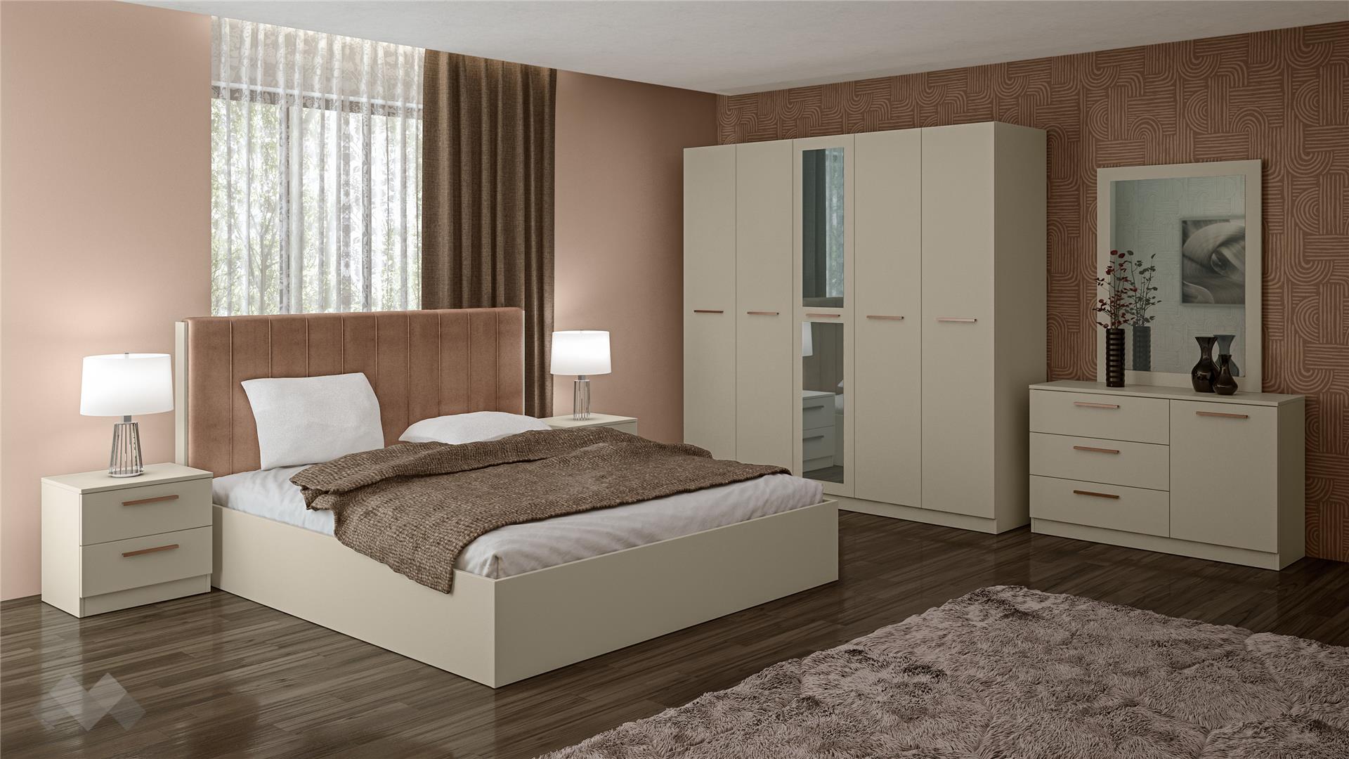 Този изискан спален комплект е обмислено проектиран да удовлетвори нуждите на модерния дом, като същевременно внася усещане за лукс и дискретна елегантност. Всички елементи са обединени от универсалния и успокояващ цвят - нежен нюанс, който е изключително гъвкав и се съчетава прекрасно с различни интериорни палитри. Розово-златистите дръжки добавят фин, но забележим елемент на изтънченост.