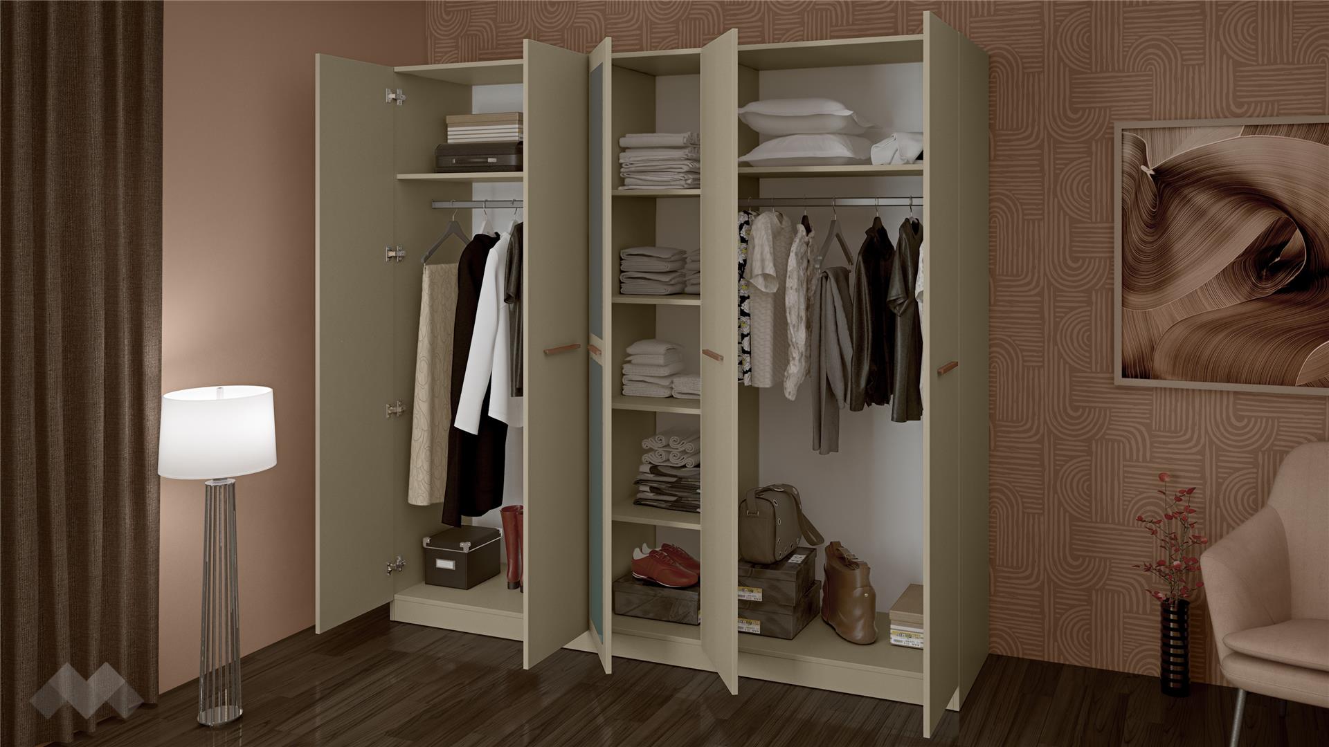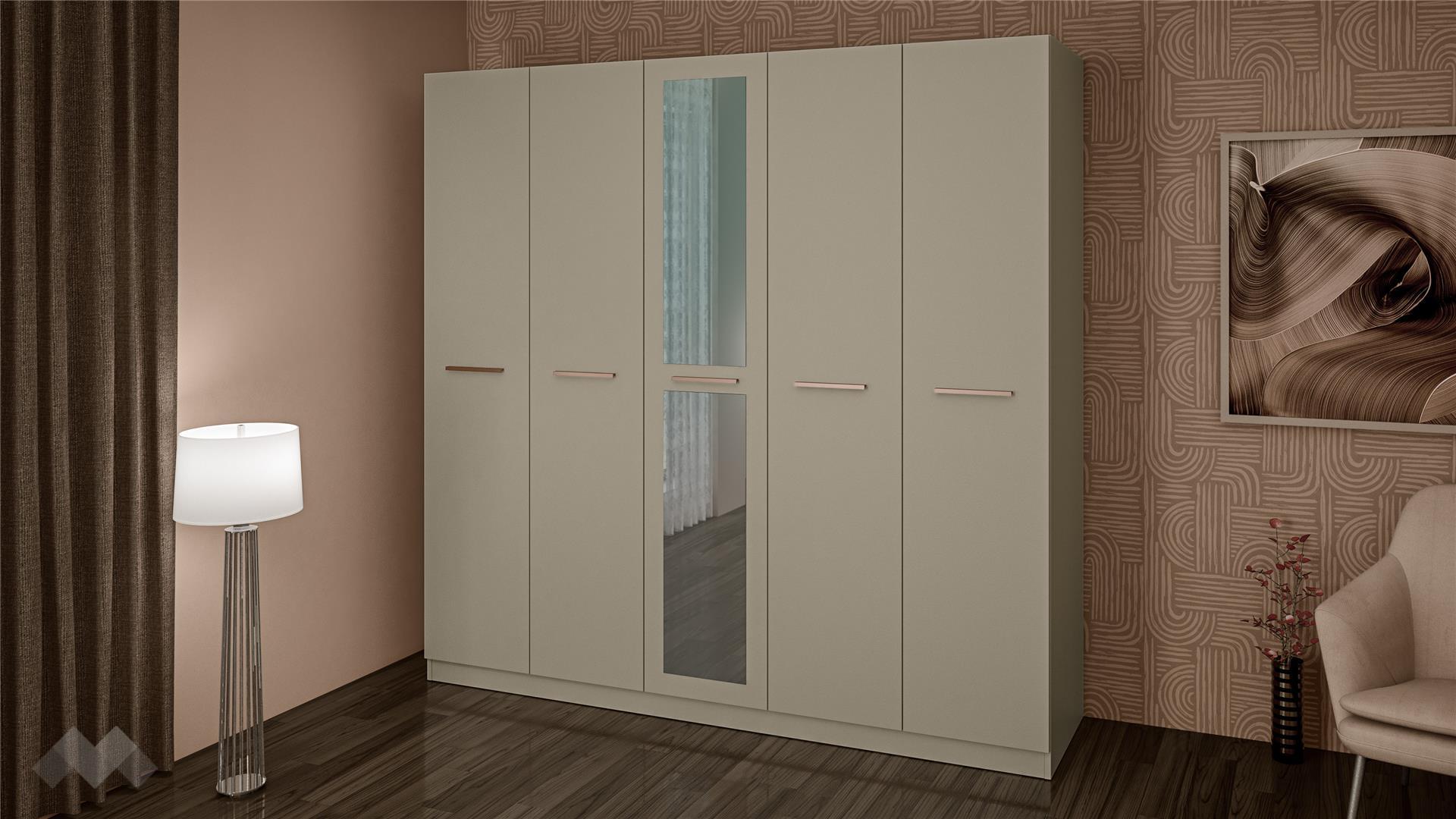 Кулминацията на комплекта е масивният петкрилен гардероб. Той предлага изключително голям капацитет за съхранение, позволявайки перфектна организация на целия гардероб. Средното крило на гардероба има огледала, което не само е практично, но и внася светлина и усещане за простор в помещението, а зад врата се крият четири рафта. Зад останалите крила на гардероба има лостове за закачалки, за да побереш още вещи и дрехи. Дългите хоризонтални дръжки продължават елегантната линия, която свързва всички елементи от комплекта.
