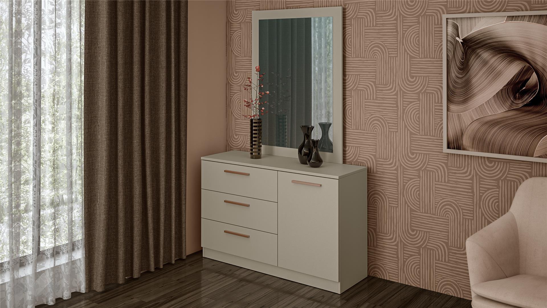 За допълнително съхранение и практичност, комплектът включва скрин с комбинирани опции. Той предлага три дълбоки чекмеджета от едната страна и шкаф с врата и рафт за нея от другата, осигурявайки разнообразни възможности за организиране на дрехи и аксесоари. Над скрина е монтирано елегантно огледало, което едновременно е функционално и оптически разширява пространството.