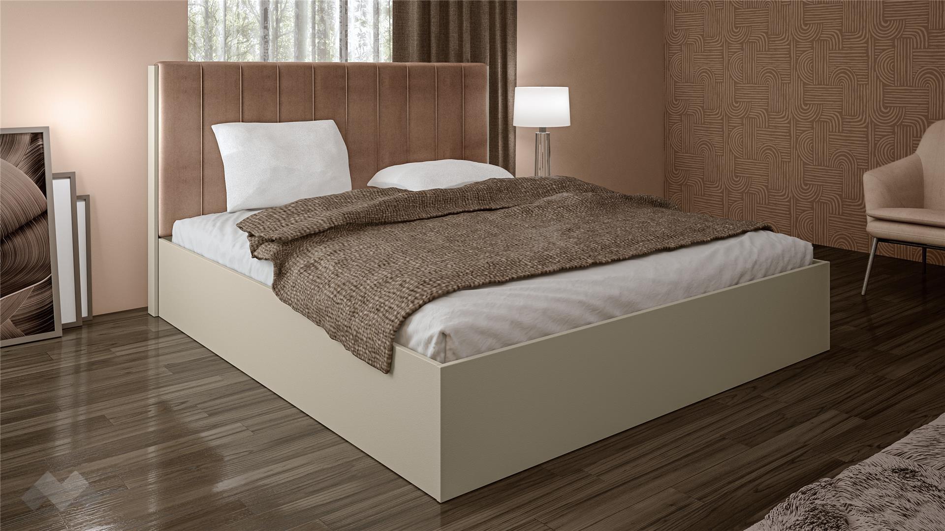Централният елемент на комплекта е леглото за матрак 180/200. Неговата основа е в цвят "дафне", осигурявайки стабилност и изчистен силует. Акцентът пада върху високата, луксозно тапицирана табла. Тя е в топъл кафяв тон, с елегантни вертикални декоративни шевове, които придават обем и усещане за мекота. Тази комбинация предлага както комфорт при облягане, така и изискана визия.