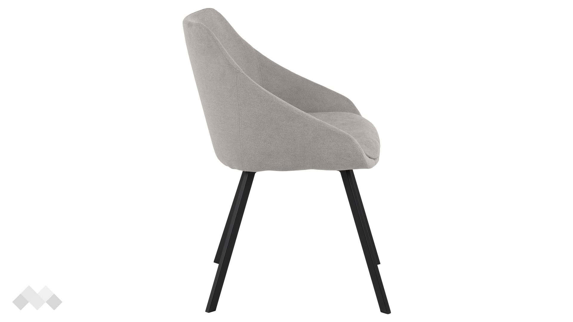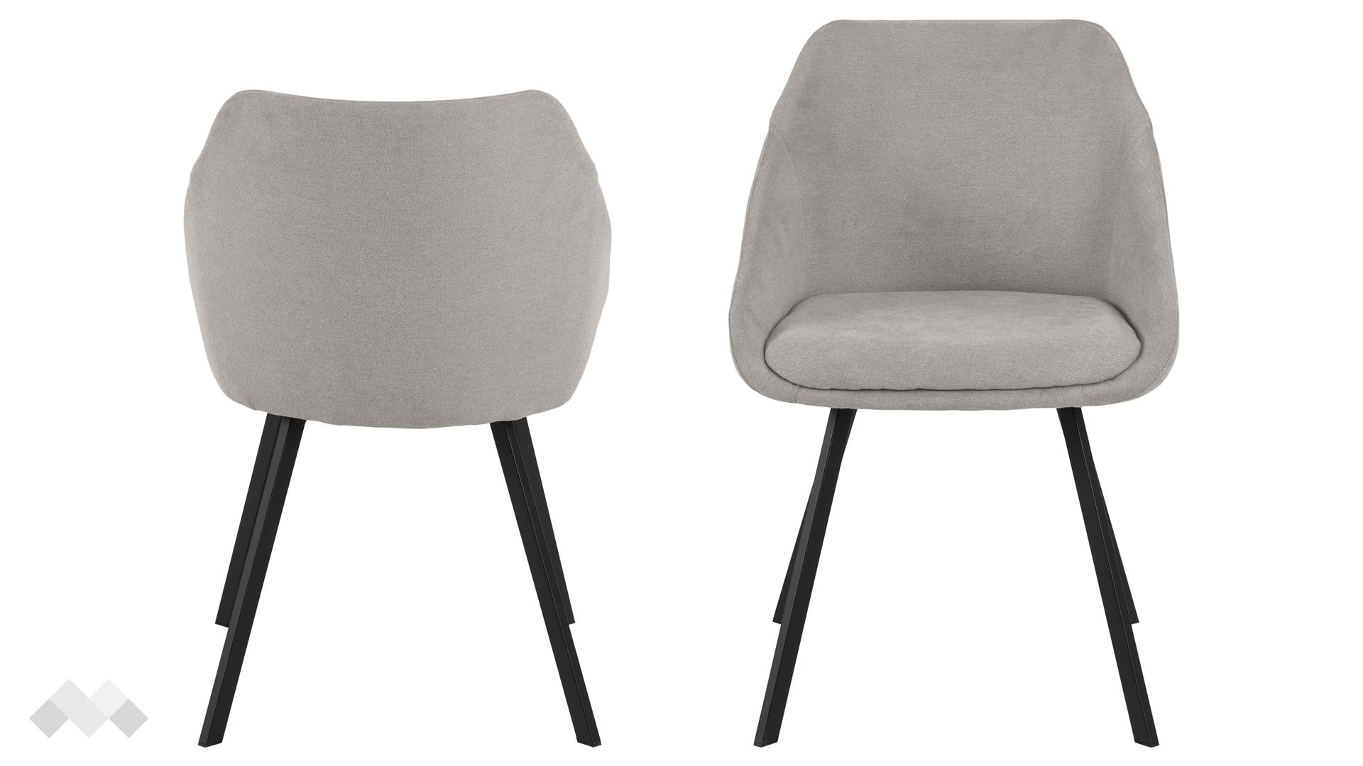 Този трапезен стол носи фокус върху скандинавския минимализъм с фините извивки на седалката си. Привлекателния външен вид на модела се подчертава от отворената предна част и омекотената седалка. Тапициран със светло сива дамаска, трапезният стол може да се съчетае с почти всеки цвят, благодарение на неутралните си характеристики. За да подчертае седалката столът стои върху матово черни метални крака.