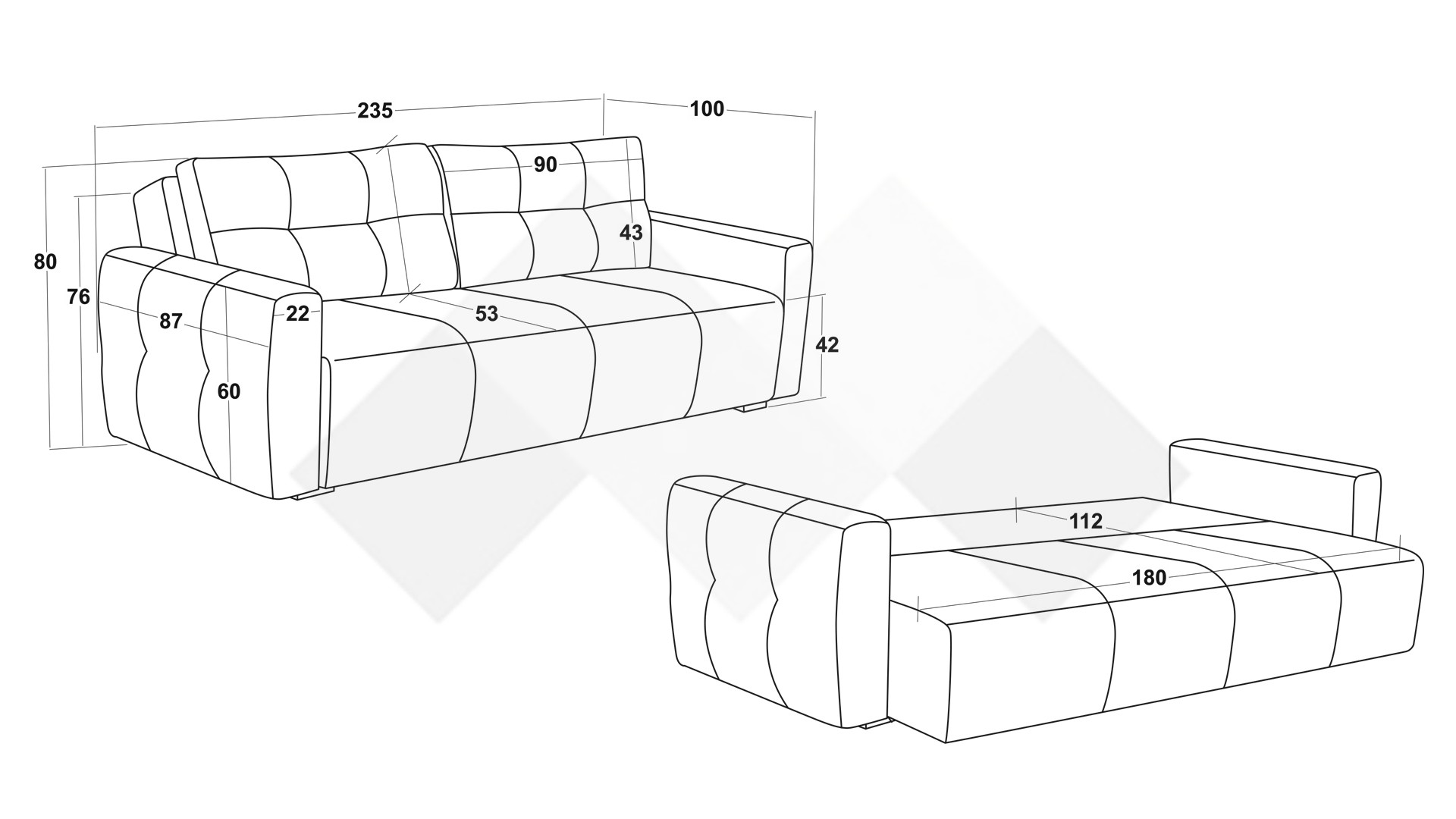 Д: 235 см Ш: 100 см В: 80 см