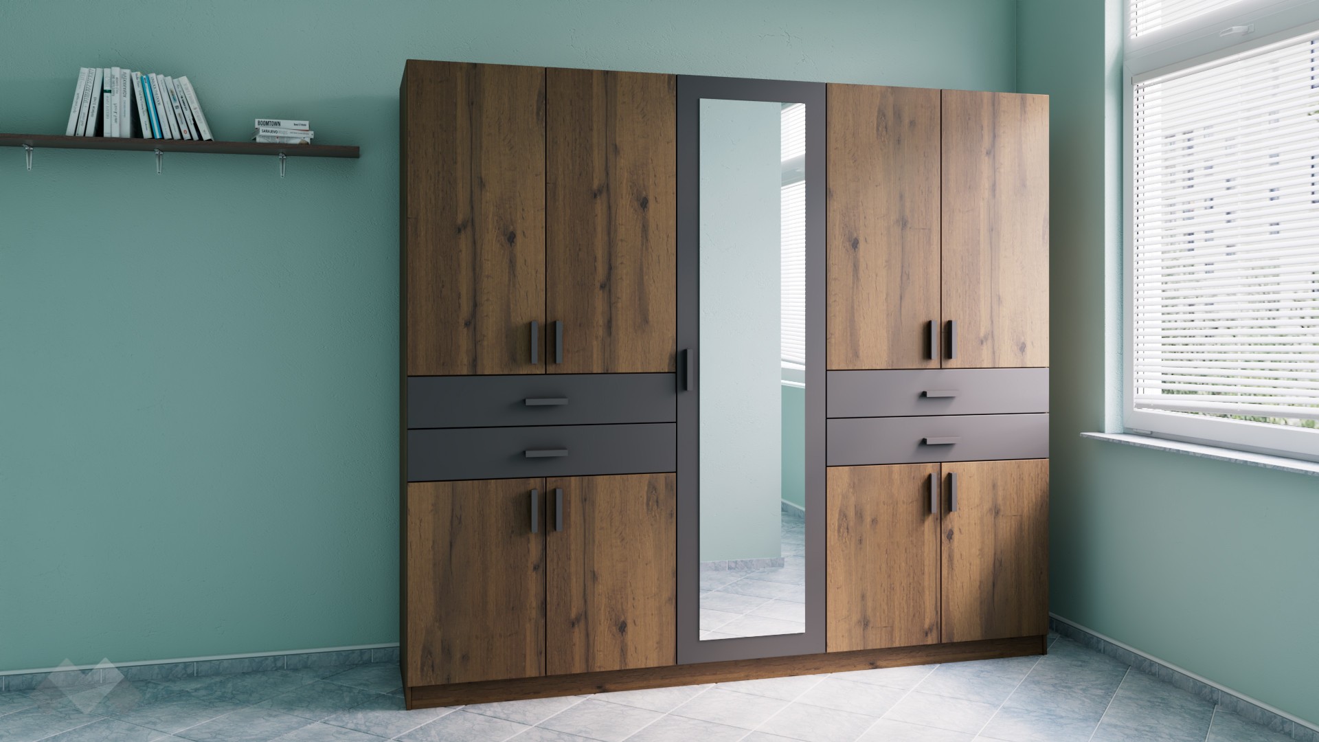 ⭐ Предимства: ✓ петкрилен ✓ 4 чекмеджета ✓ 3 рафта ✓ 2 шкафа ✓ 3 лоста за закачалки ✓ модерен декор с WNR структура ✓ практично разпределение ✓ качествена изработка ✓ 16 мм ПДЧ