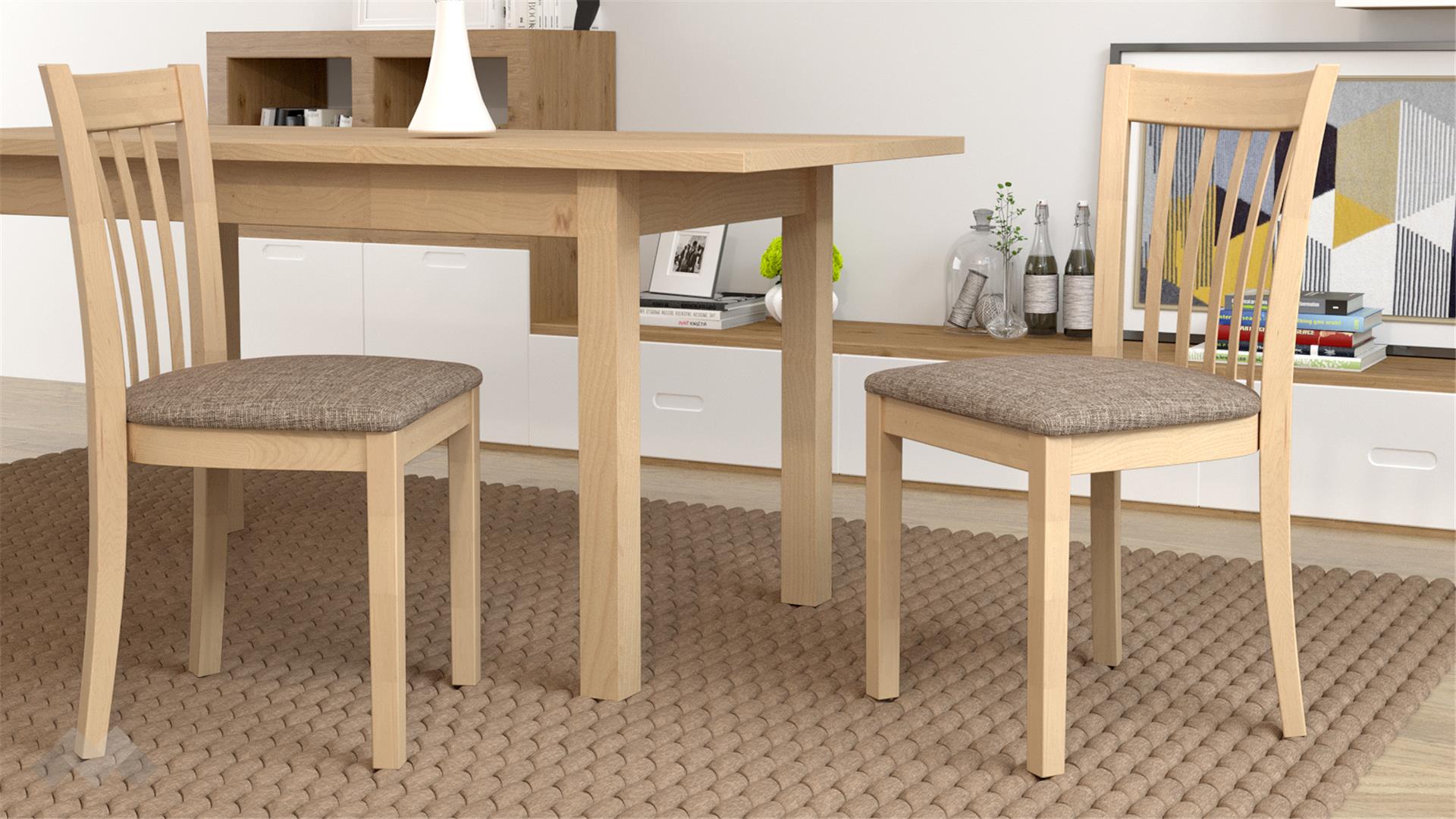 Столът е със здрава конструкция от естествена букова дървесина за устойчивост и стабилност, а лаковото покритие добавя елегантност. Седалката е проектирана с твърда основа, тапицирана с дунапрен за повече комфорт при седене и завършен със здрава текстилна дамаска, лесна за поддръжка.