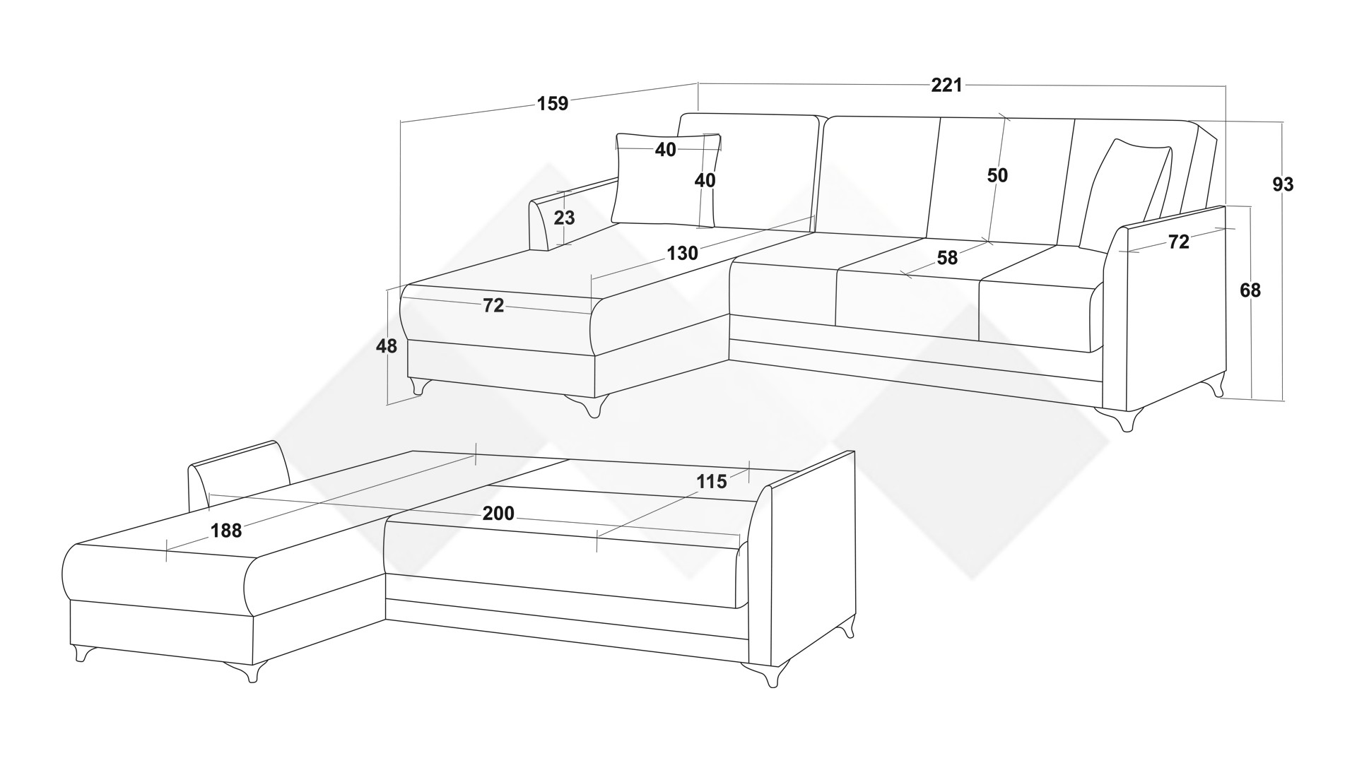 Д: 221 см Ш: 159 см В: 93 см