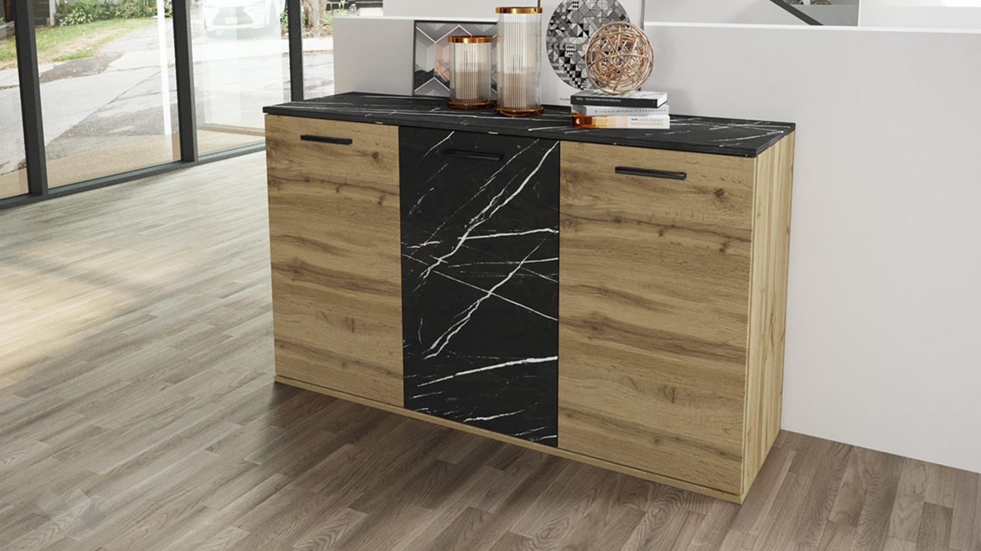 Ако търсиш практичен шкаф за дневната или удобен скрин за спалнята – скрин Кевин е отличен избор за теб. Със своя екстравагантен дизайн и естествени нюанси, скринът предлага стилно решение за съхранение на твоите дрехи и вещи. Декорът имитиращ мрамор е изключително актуален и определено ще получи одобрението на твоите гости.