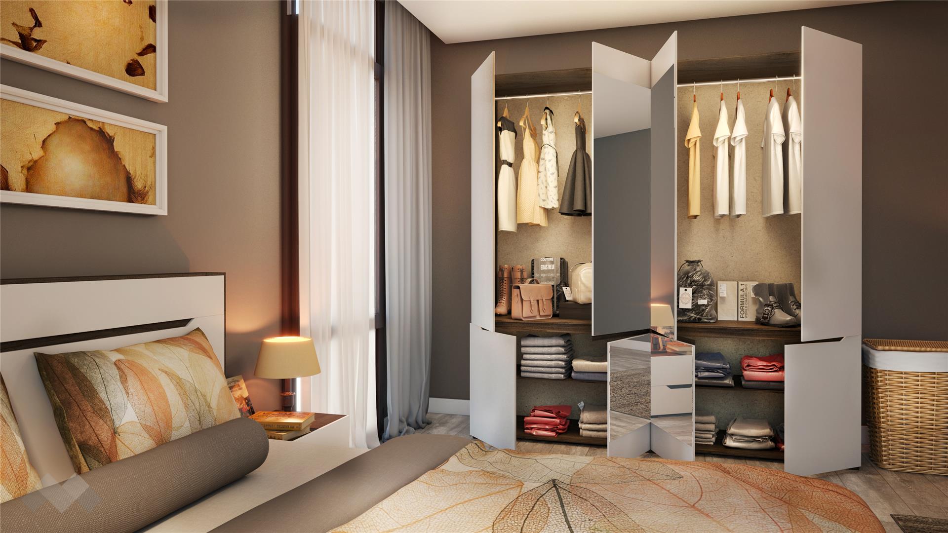 Гардеробът е четирикрил с оптимални размери. Пространството е разпределено между четири рафта и два лоста за закачалки и ти позволява да обхванеш с поглед всичко, за да подбереш бързо тоалетите си. Вратите са с панти с плавно затваряне, а над лостовете за дрехи е вградено практично LED осветление. По цялата височина на две от вратите са монтирани практични огледала.