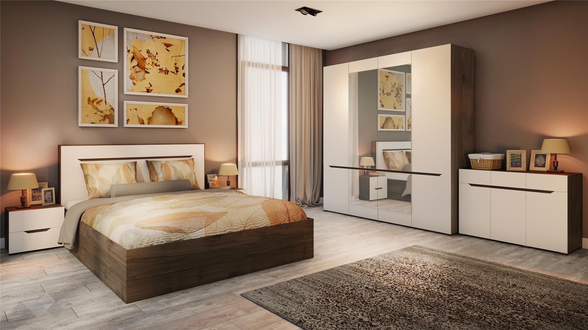 ⭐ Предимства: ✓ голям гардероб с огледала и LED осветление ✓ включен повдигащ механизъм с дъно ✓ нощни шкафчета ✓ красива и стилна цветова комбинация ✓ скрин ✓ 16 мм ПДЧ
