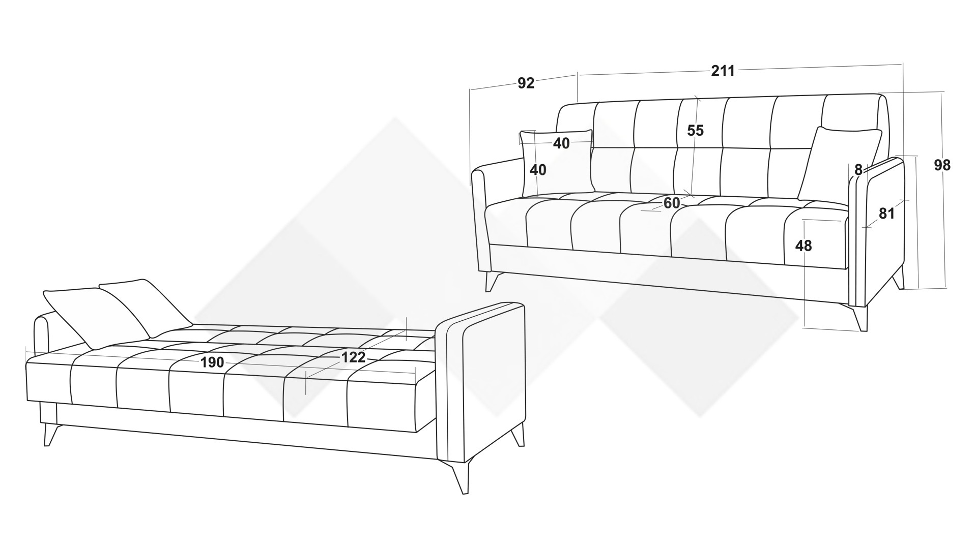 Д: 211 см Ш: 92 см В: 98 см